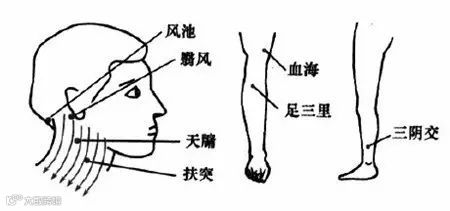 (1)祛除颈纹刮拭方法:用按揉法点按风池、翳风、扶突、天牖,每穴点30次。此方法可以清肝泻胆,清除机体代谢产物,利于颈部邪气清除用三角形水牛角刮痧板的弧形边,在皱纹较多的阿是穴部位周围从上向下刮拭力度不可太大,并可采用摩、揉、托、拍、提等多种手法,刮拭约5~10遍阿是穴可以直达病所,有利于皱纹的消除。 用长方形水牛角刮痧板刮拭血海、足三里、三阴交。