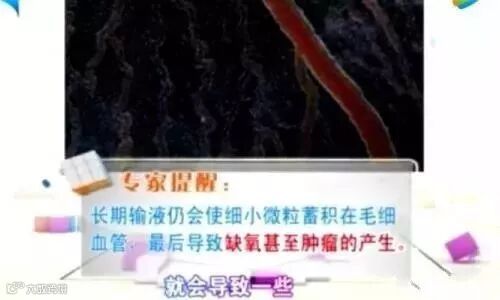 血管里流淌的血和机体组织之间,是存在一个气血交换的过程,主要是通过毛细血管进行。但如果经常输液,毛细血管就有可能会被这些颗粒堵住,久而久之,不仅经络会堵住,而且还会形成肿瘤。由于这一过程是渐进式的,所以,当你发现情况不对时,可能是若干年以后的事了,因为你无法找到证据来证明,你这个肿瘤是不是因为N年以前输液留下的后遗症。