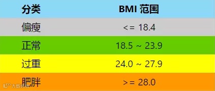 BMI是世界公认的一种评定体重的分级方法。按照2003年原卫生部颁布的《中国成人超重和肥胖症预防控制指南》,体质指数(BMI)低于18.4为偏瘦,超过24为过重,超过28为肥胖。