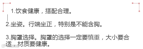 4.定期检查。定期到医院做乳房部的体格检查,平时自己也应该注意乳房的健康,如果有不适或者不正常的症状,一定要尽快检查。