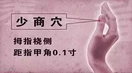 少商穴在指甲旁边。少商穴治嗓子痛效果最佳,尤其是对急性咽喉肿痛有特效。但是这个穴必须得强刺激才行,过去这些井穴(末梢的穴都叫井穴)通常都需要用三棱针来点刺,放一滴血,当时就会见效,但好多人就怕放血,这时不妨用指甲使劲掐一掐。