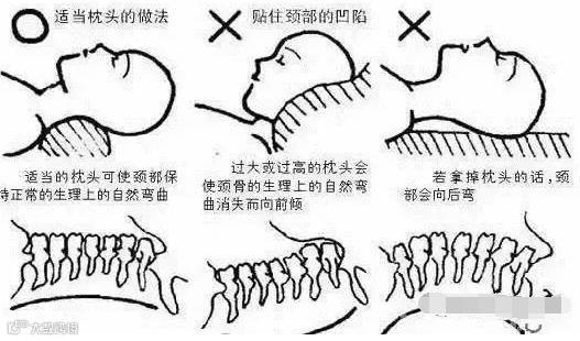 选择合适有支持的枕头不能过高,或是可以在在颈部放一个小垫子,以支持正常颈椎曲度。