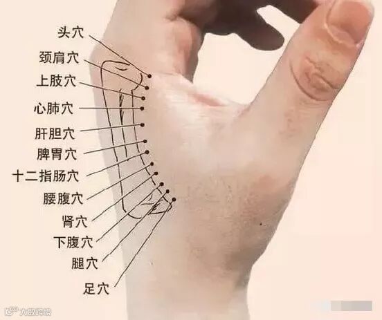 8、临时性便秘:可用推第2掌骨的胃穴至足穴这个区域的方法来促进排便。需要注意的是,这个方法同样不能经常使用,多用会泄气。