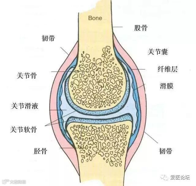 一个完整的膝关节,不仅仅包括骨,还包括骨表面的软骨、滑膜、关节囊、肌肉、韧带等组织。这些软组织使关节保持稳定性。在关节的骨与骨之间有一定的间隙,这个间隙中充满了关节软骨,被关节囊所包绕,形成一个密闭的腔隙,称做关节腔。而滑膜会分泌少量的润滑液在关节腔里,起到润滑关节和保护关节软骨的作用。