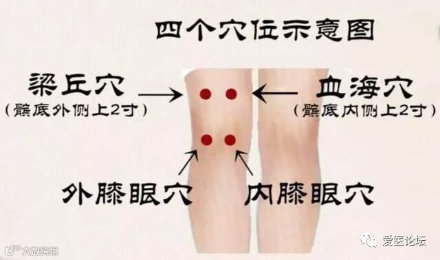 取穴:梁丘穴、四海穴、外膝眼穴、内膝眼穴