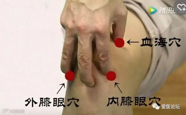 拇指按血海穴上,食指和无名指分别按在外膝眼穴和内膝眼穴上。