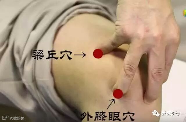 中指按在壁韧带上,小手指按在梁丘穴上。