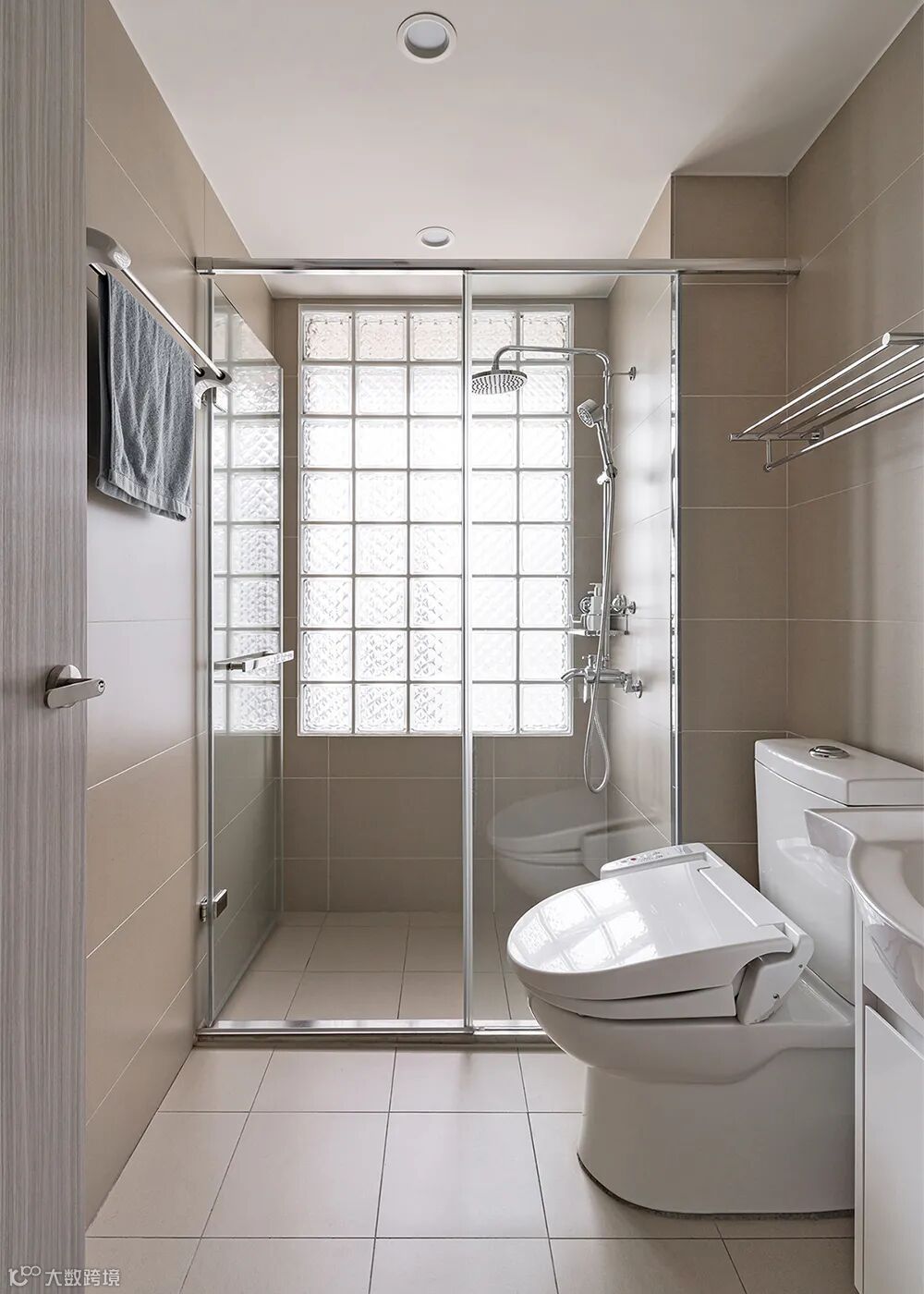 敞开卫浴门是必要之举,于内选用柔和粉肤磁砖
