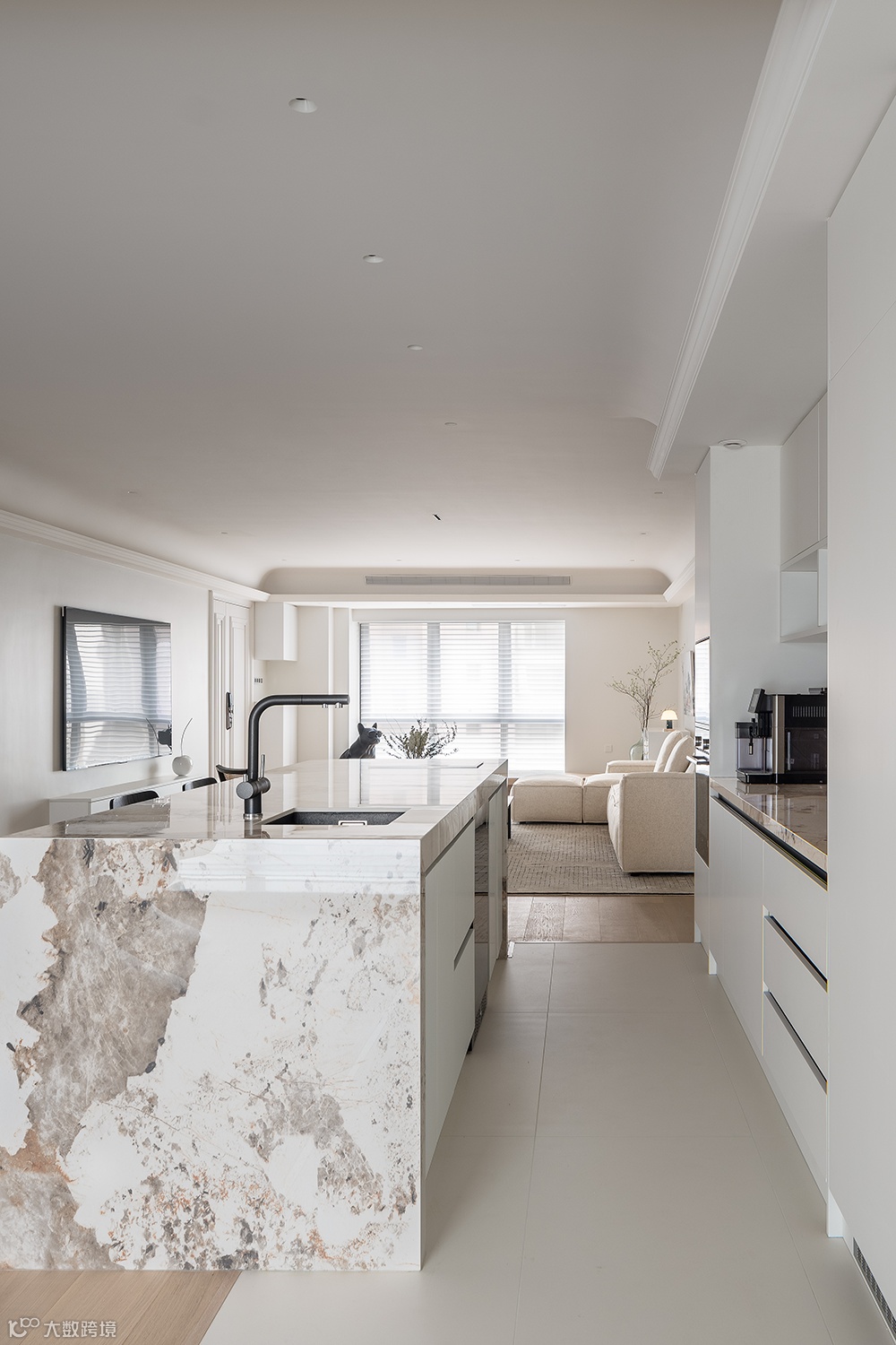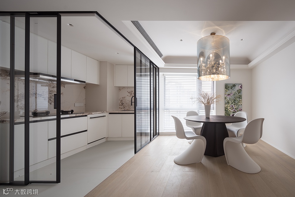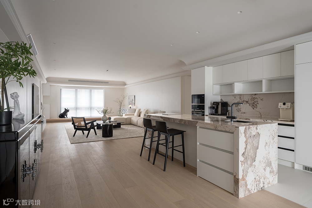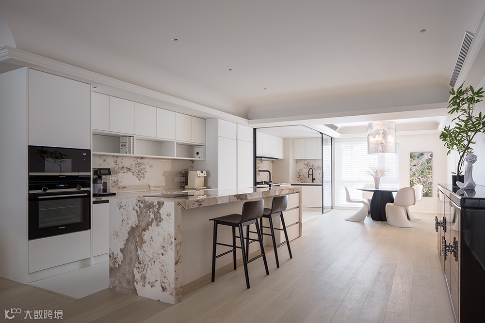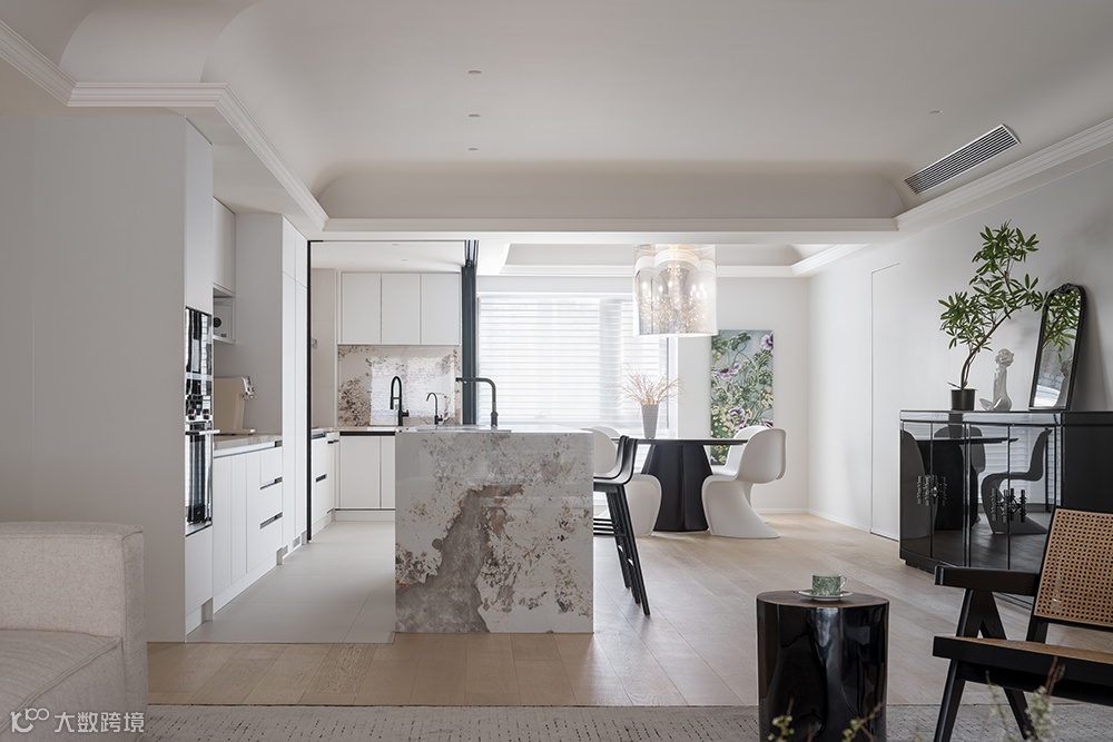 餐厨区域,重新绕梁做了石膏线吊顶处理,简约大气,视觉上极简留白又不失设计感。