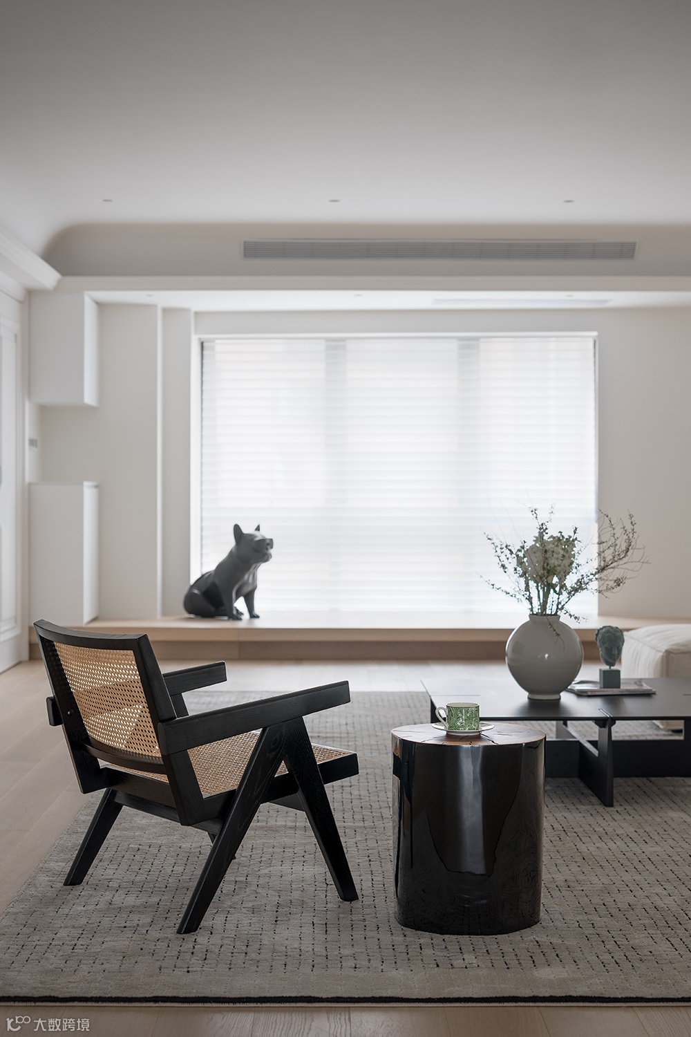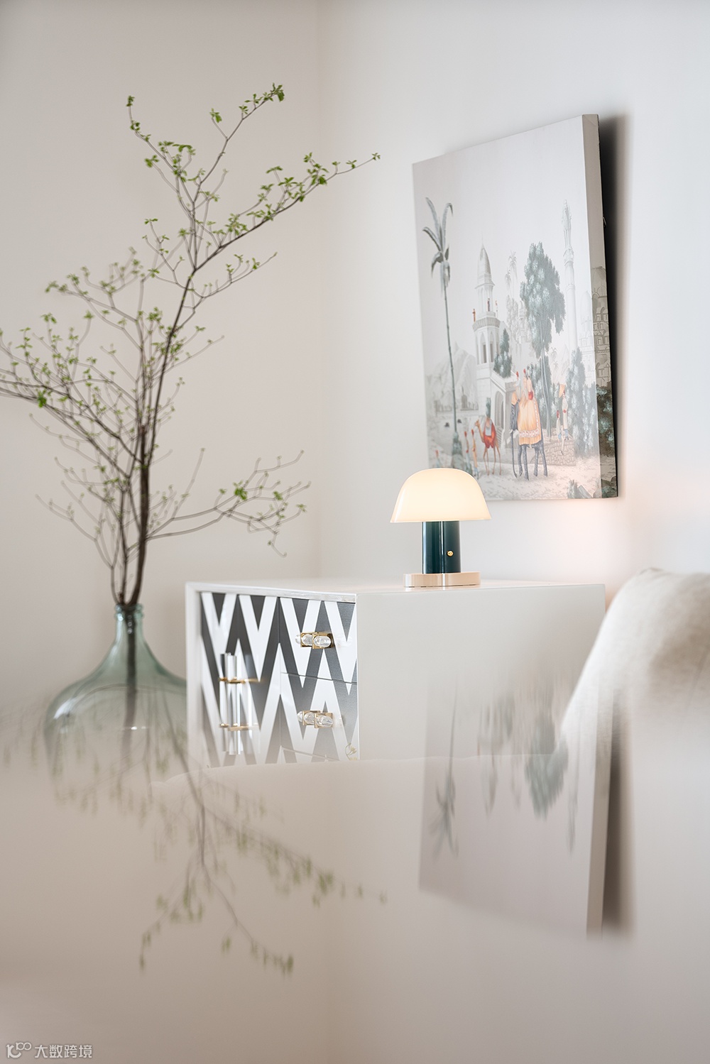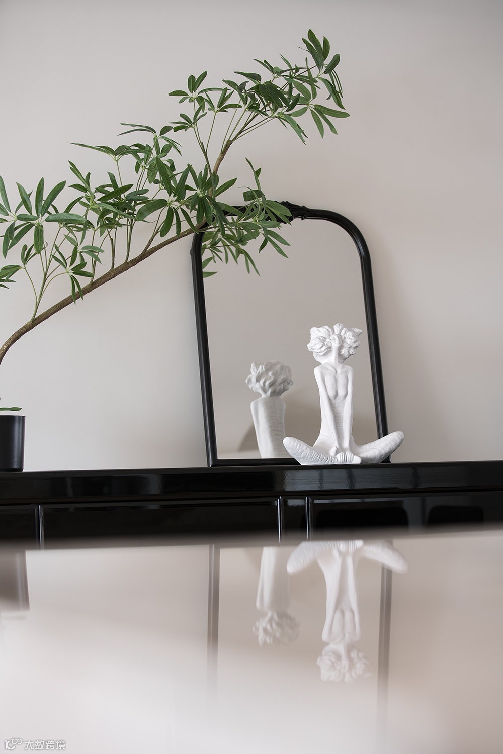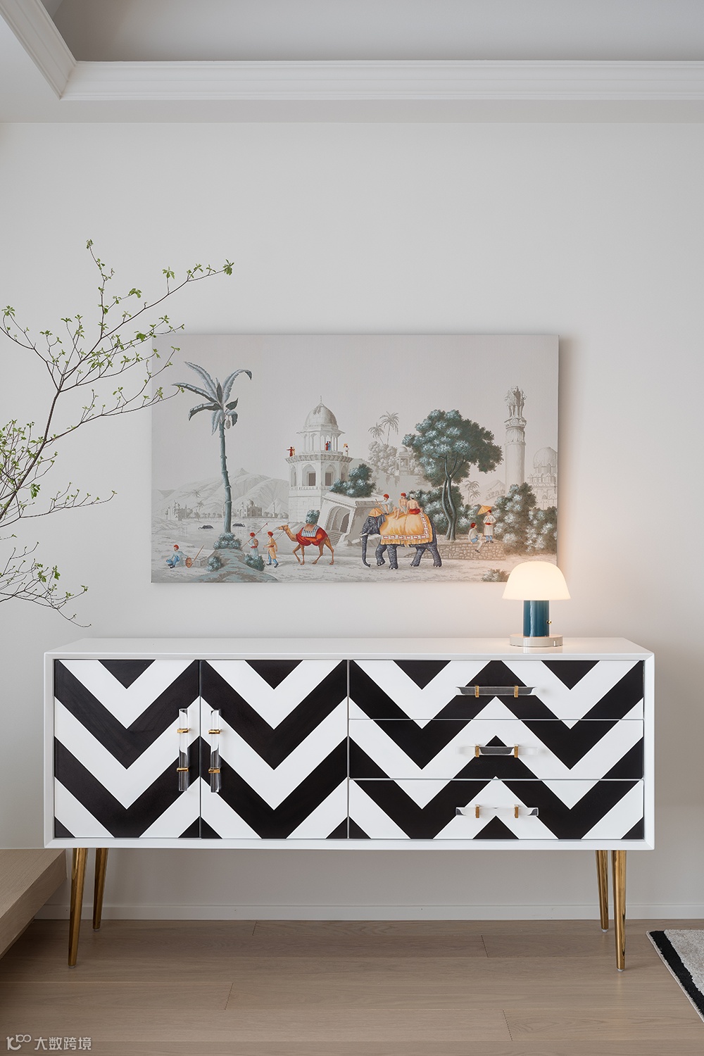 黑白极简几何感的艺术玄关柜、搭配艺术装置画、个性艺术品,丰富了空间的延伸感与想象力。