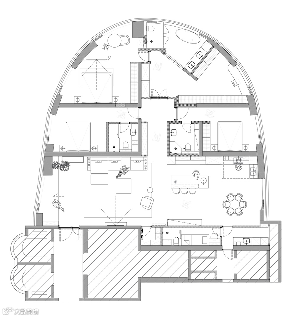 设计将保姆间与公区卫生间面积各缩小一半,释放多余空间给到客餐厅,原客厅的凸角区域也被拆除拉平,客餐厅更加敞亮大方。