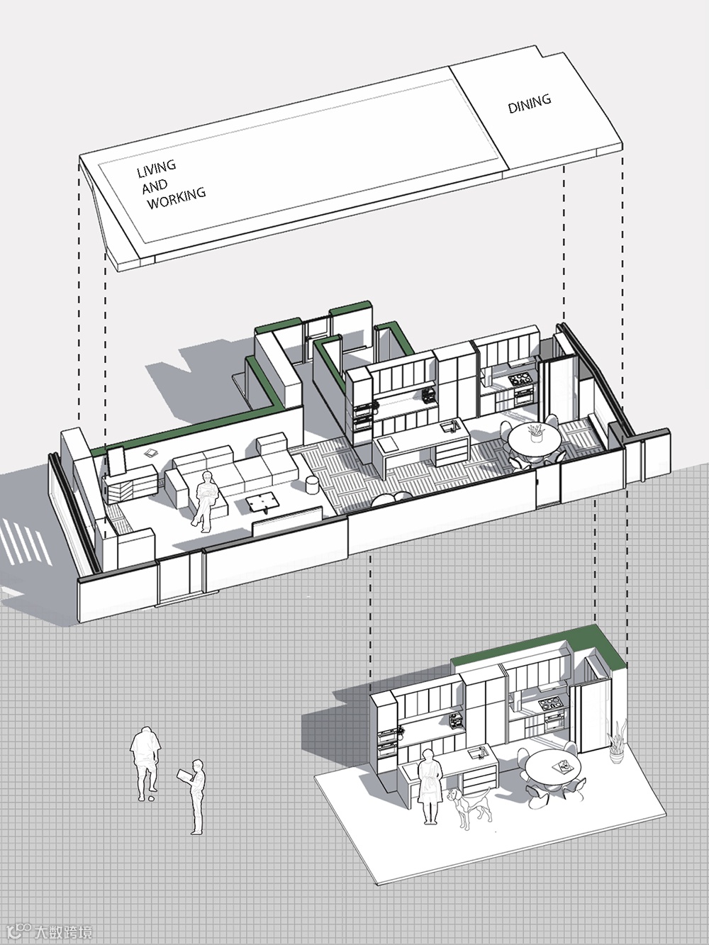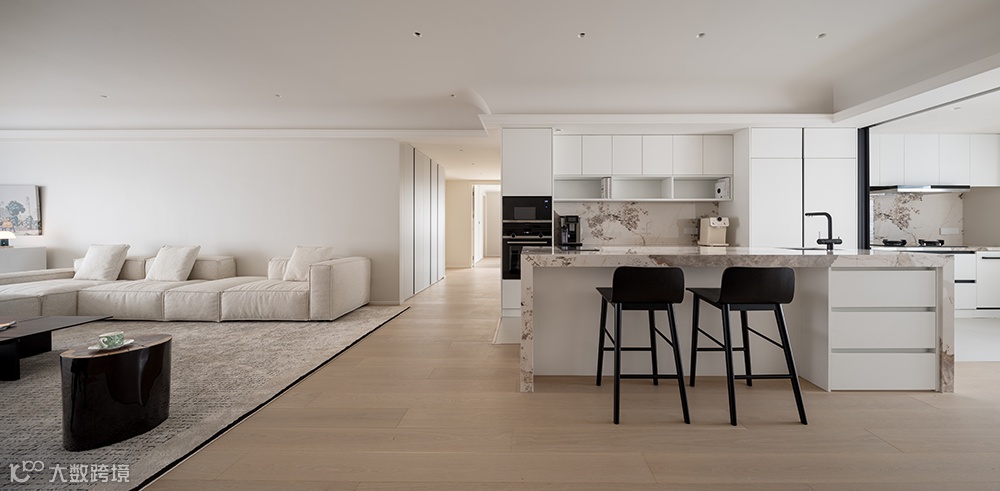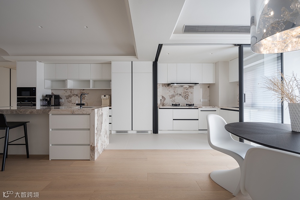 新增设的3m左右岛台作为中转区,既具有收纳功能,也加强了互动感。