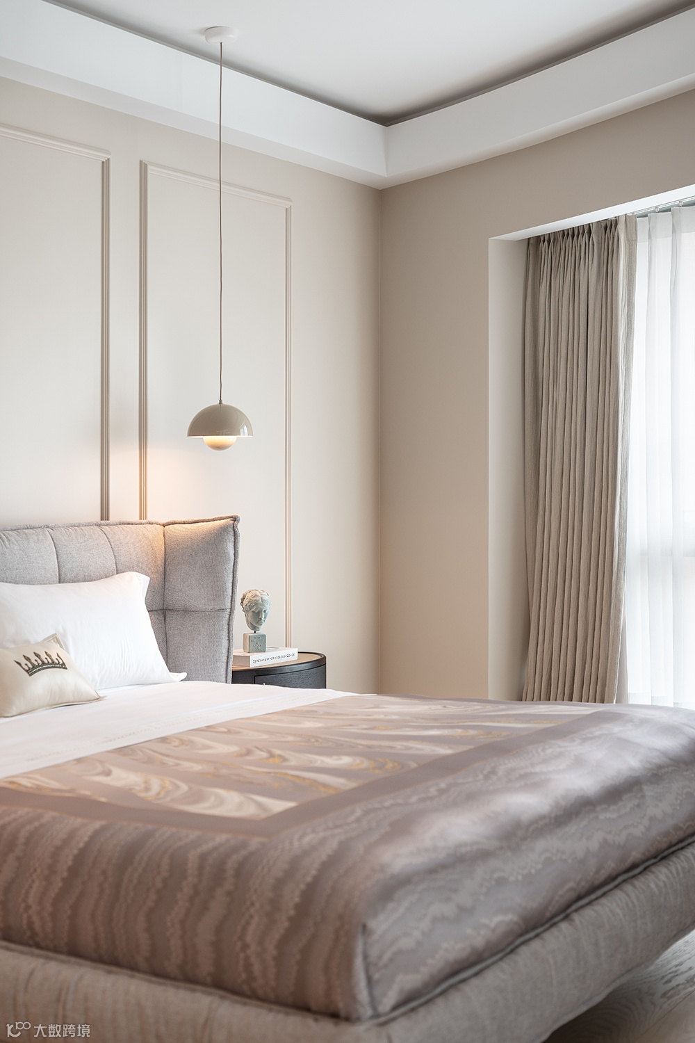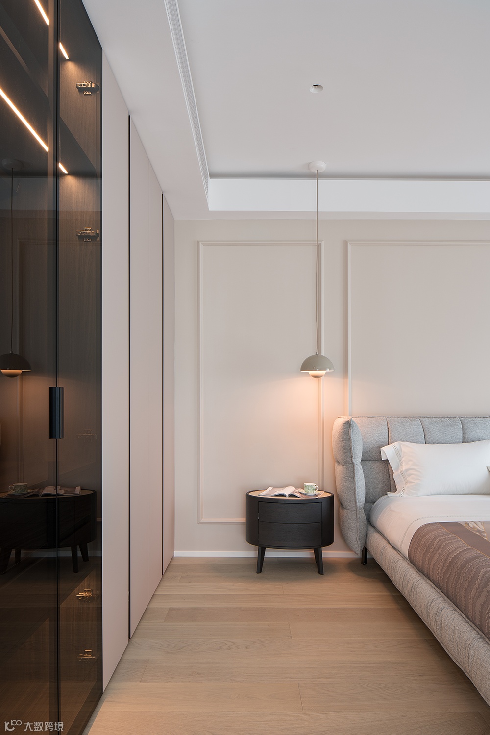 主卧整洁宁静的配色,呈现至简至美的气质,原木质感的材质,柔和的灯光设计让空间富有节奏感。