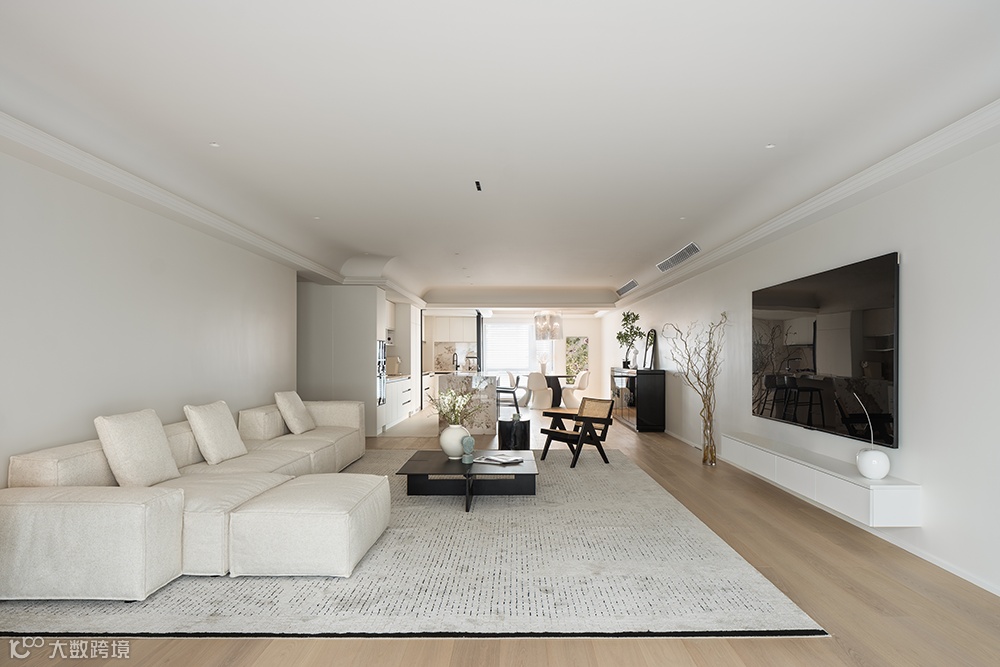 客厅串联起节奏分明的生活动线,作为时尚自媒体博主,女屋主对光线以及空间的氛围要求较高,设计师将采光较好的厨房打通,客厅墙推掉后,横向布置为中西双厨。