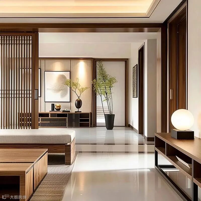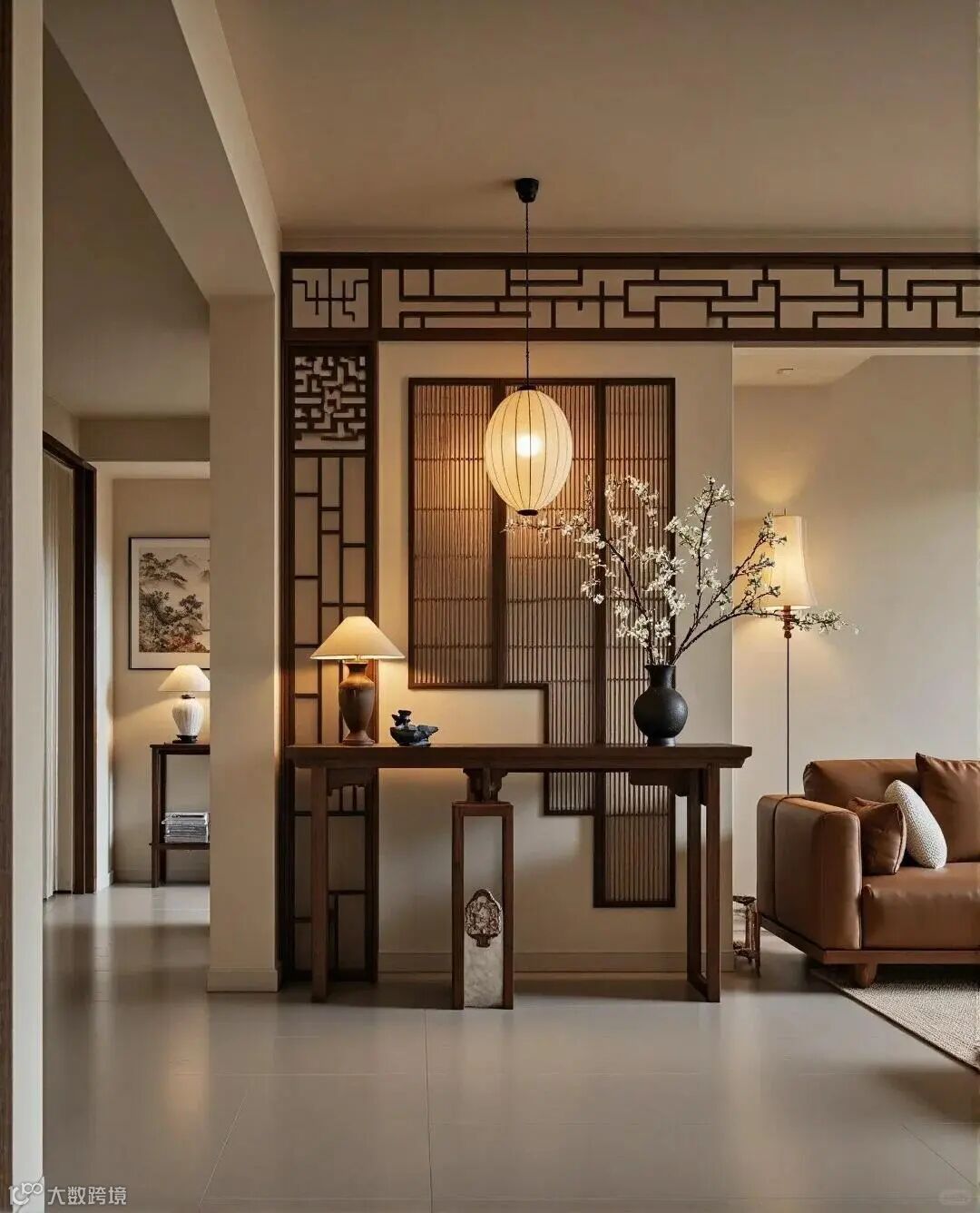 玄关是归家的过渡空间,要实现 “遮挡 + 实用 + 禅意” 三重功能: