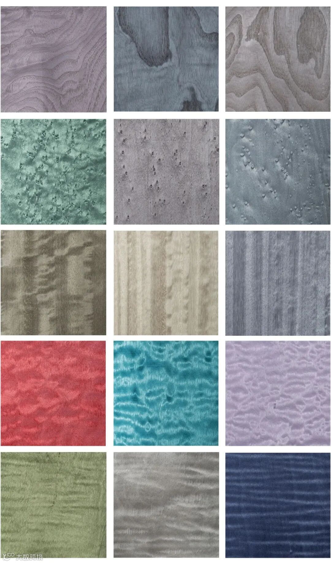 染色木皮常与多层板结合组成饰面板应用在装饰领域,自由组合定制,表面肌理保持了天然纹理的美学属性,色彩能够经过精心设计定制。