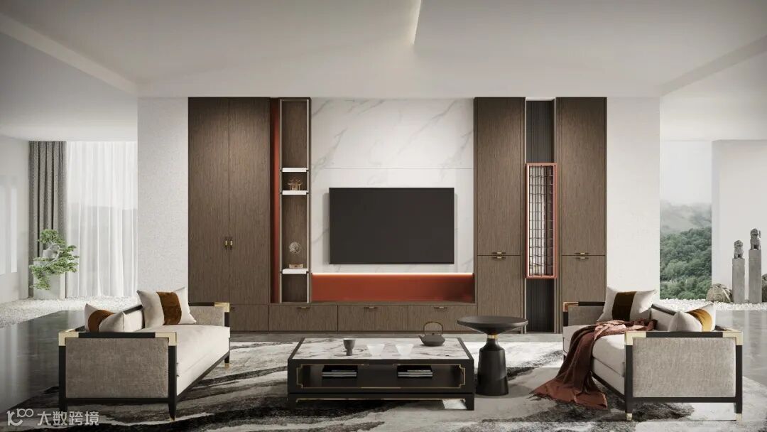 客厅采用中轴线对称性中间面,运用鱼肚白做墙板设计,增加视觉开阔面,开放柜和故宫红为该产品视觉焦点,从颜色到材质,营造中式轻奢美感。