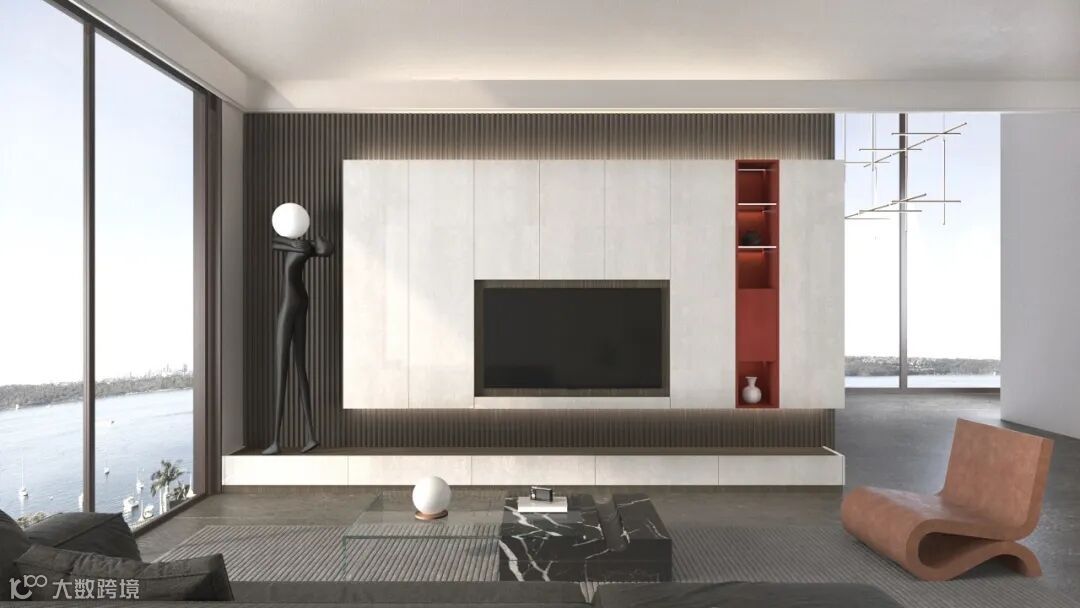 其运用大色块分割的艺术手法,左侧独特的层板设计,为艺术品提供展示区域;整墙的收纳柜,可轻松容纳生活各种杂物;深度银色格栅板与红色软装,又增添了空间细节层次。