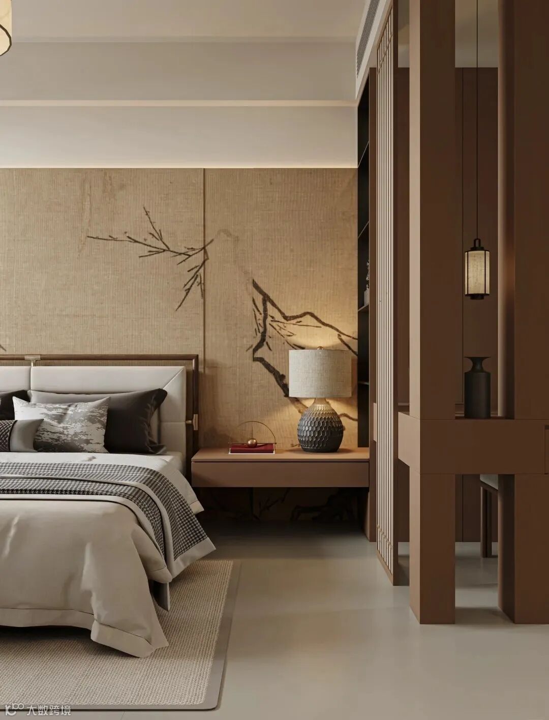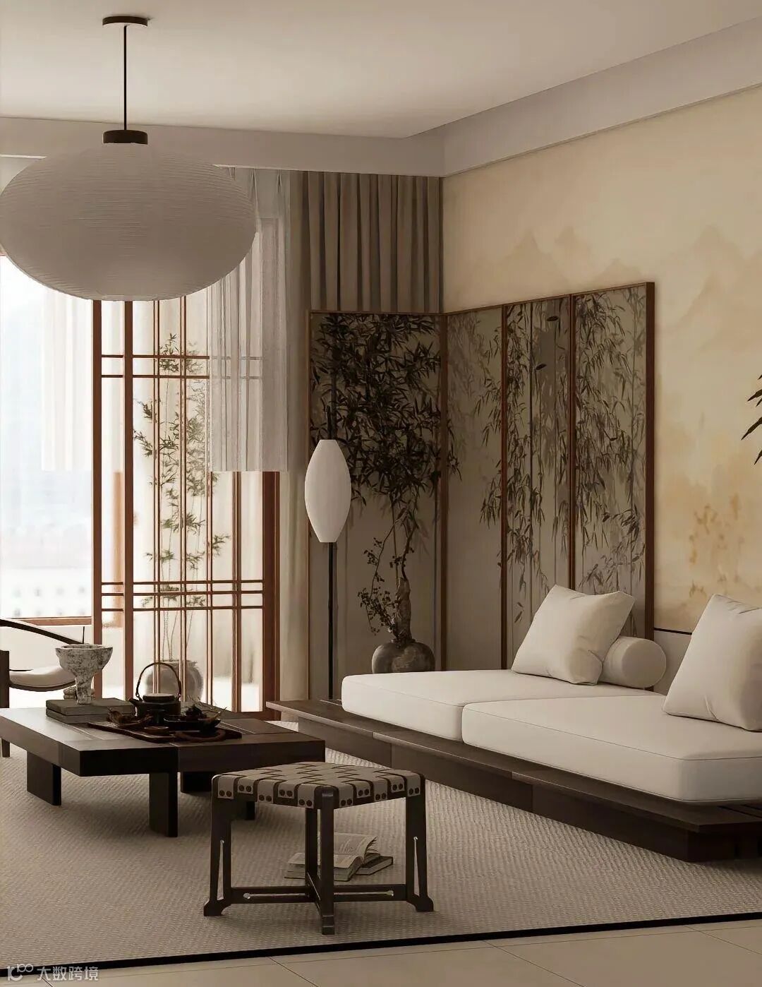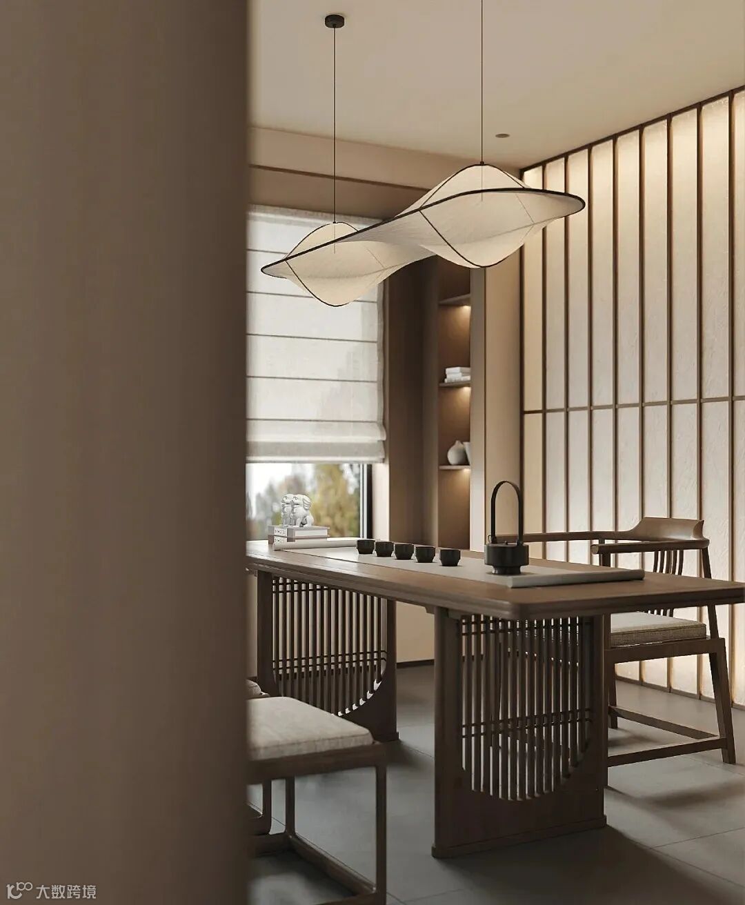 从硬装到软装抛弃繁复,不事雕琢,在空间的分隔上,以屏风、隔窗帘子来做分割,尽显传统文化“藏”与“露”的深意。