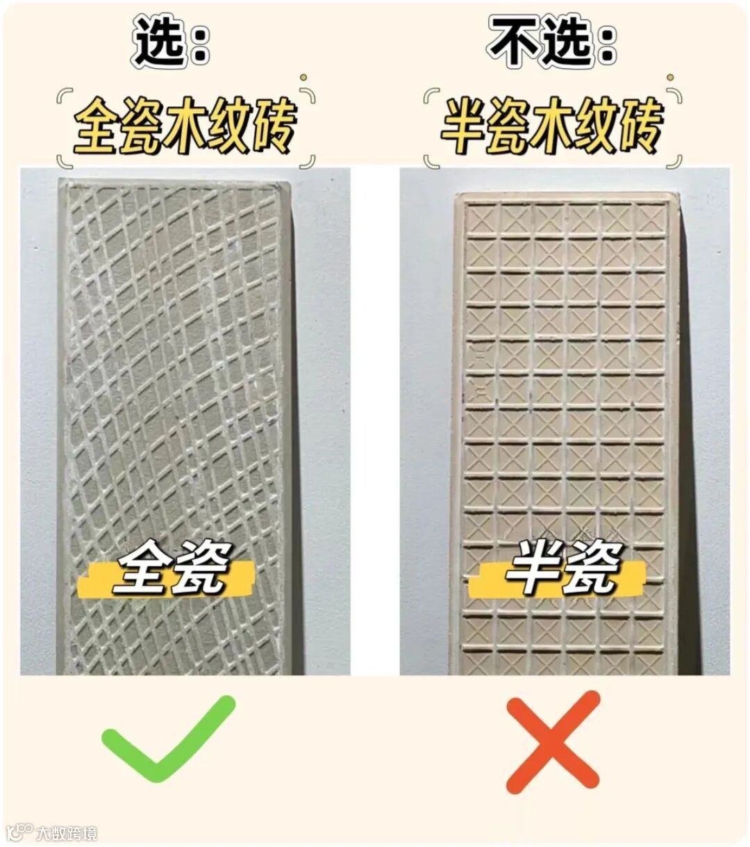 先看材质,这是木纹砖耐用性的关键,主要分全瓷和半瓷两种,差别特别大。全瓷木纹砖是我的首选推荐,吸水率特别低,铺贴前不用泡水,施工更省心,而且平整度、硬度都在线,家里有小孩、宠物随便造,耐磨耐造不易坏。反观半瓷木纹砖,就差了不少。