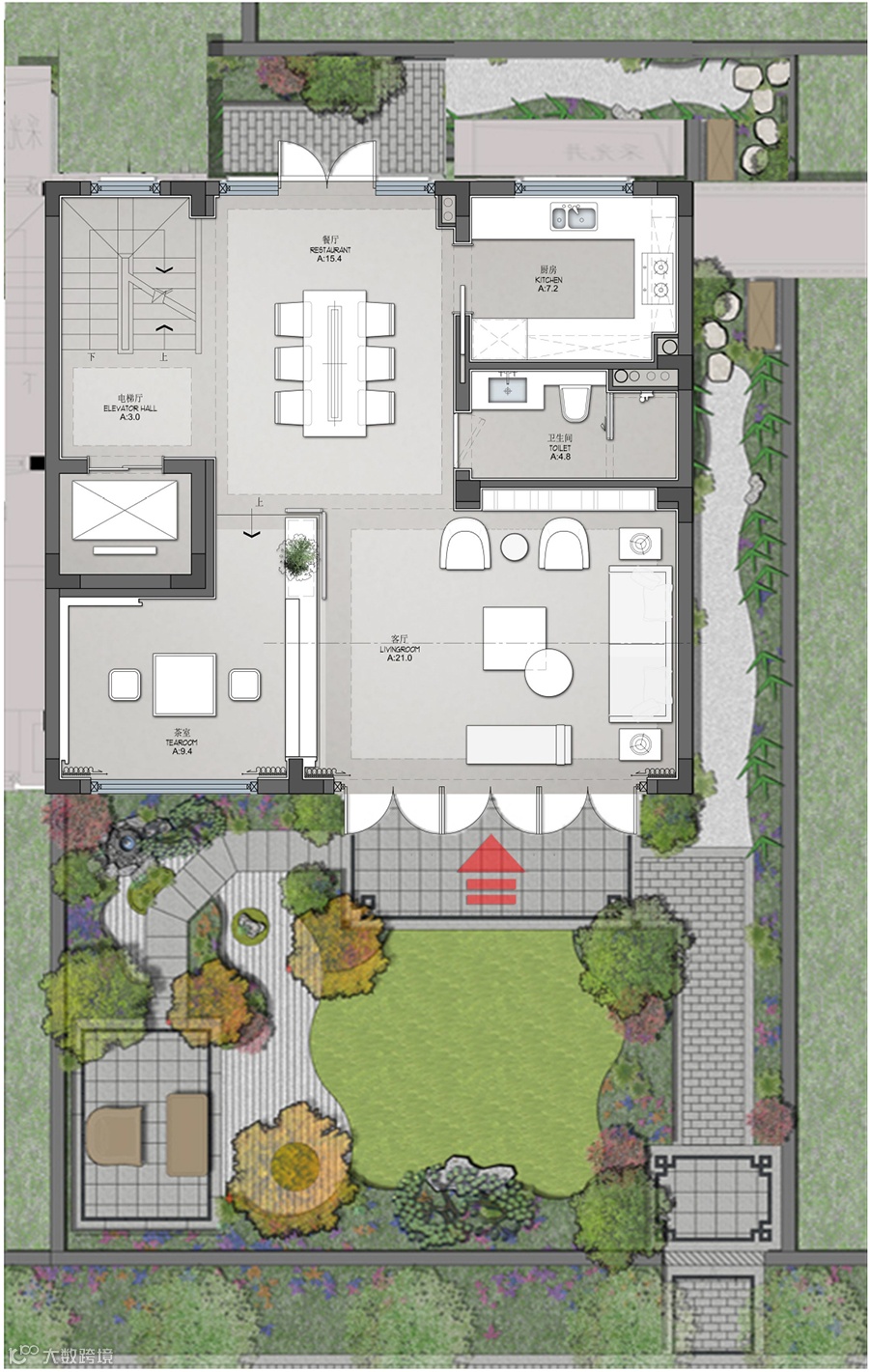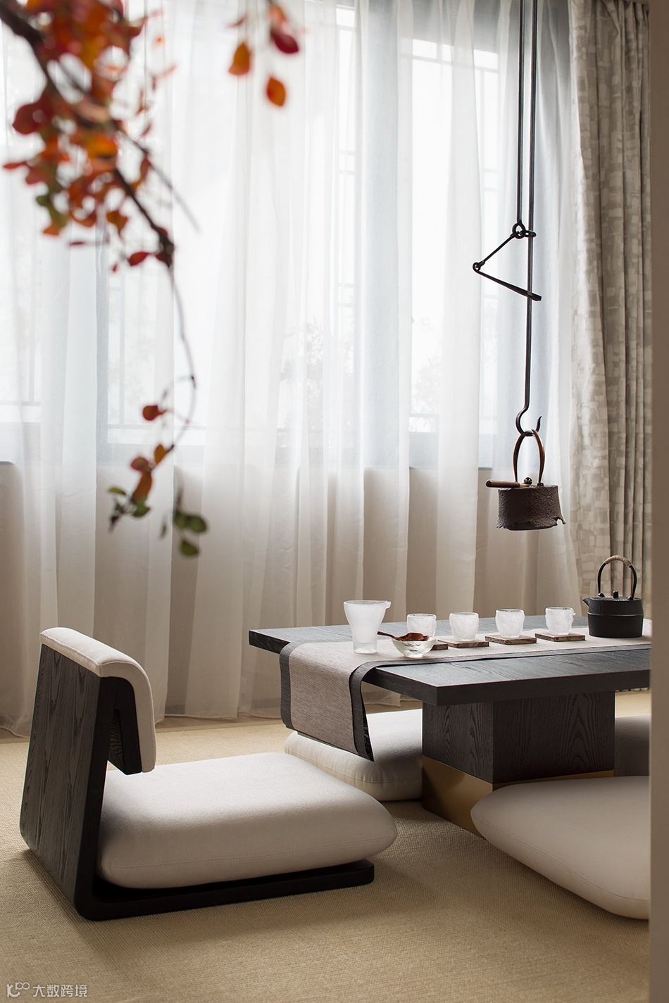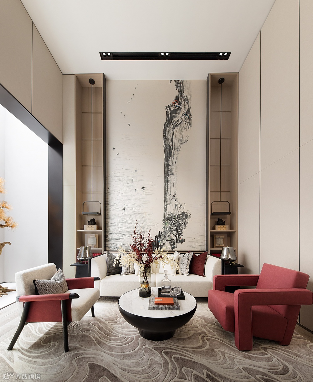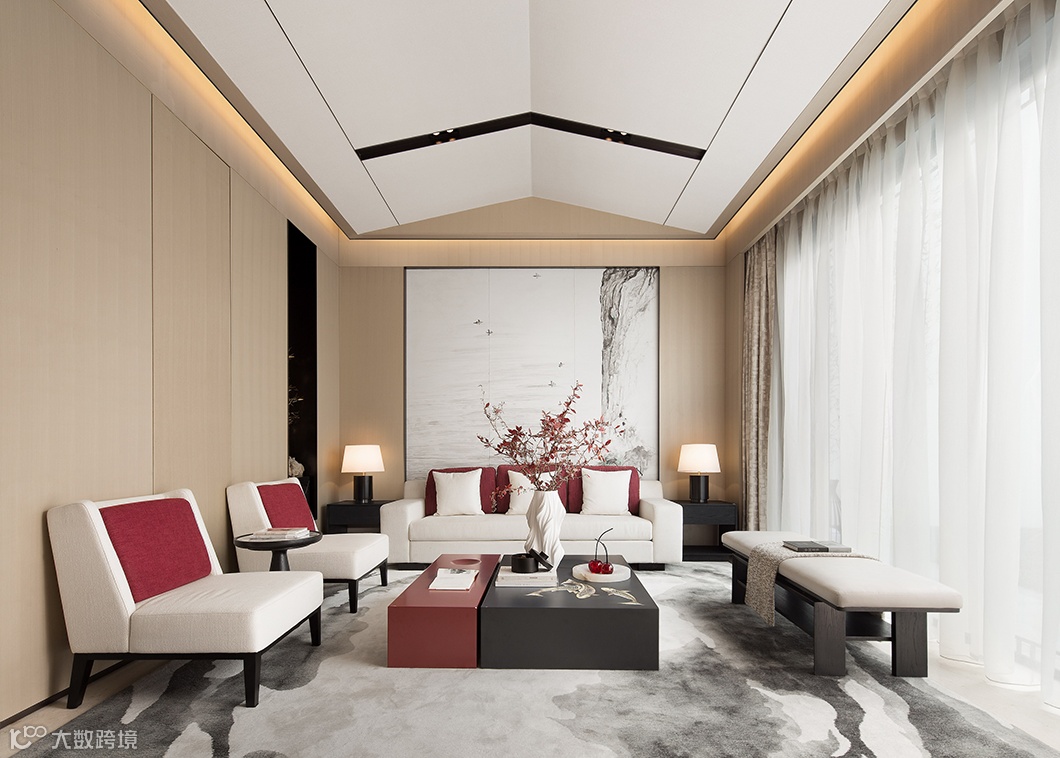 室内大面积的木饰面,木地板,点缀鲜亮的红色,甩掉空间的压迫感与单调感,旨在遵循传统中式室内空间做法,将自然元素融入空间之中。
