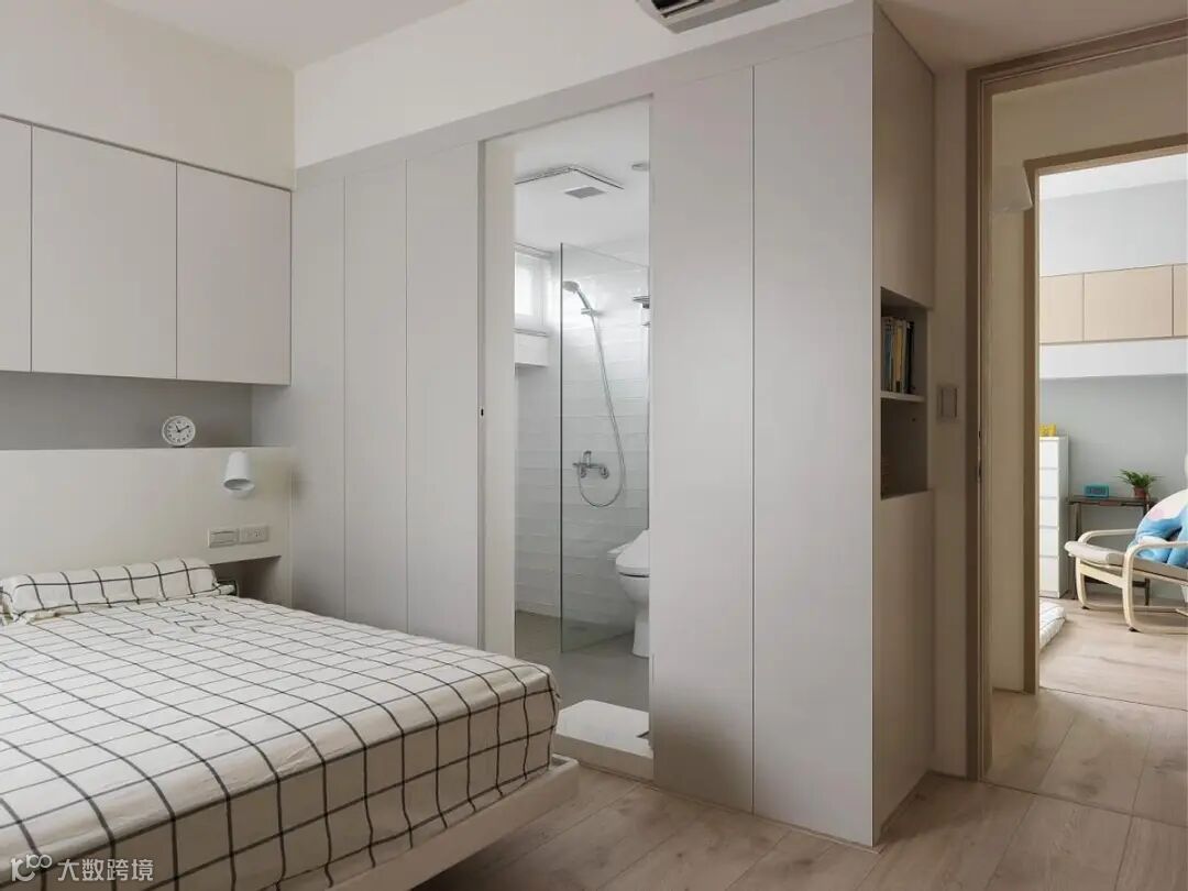 你是不是跟我一样以为这一整面墙是个衣柜?其实不是,它中间有个隐形门通向卫生间,这种方式你们也可以借鉴哦,既有趣味性又有整体感。