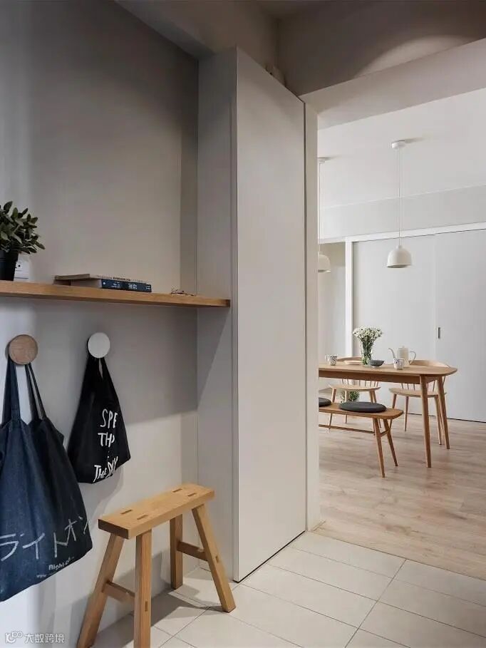 推开入户门,利用地砖界定玄关区域,有效划分功能区也便于日常清洁。墙上安装搁板放置钥匙、门卡之类出门要用到的小件物品,方便至极;下方安装挂钩则用来挂些包包、方便袋,你看,只要利用好墙面,也能让狭小的玄关拥有较好较完善的收纳功能。
