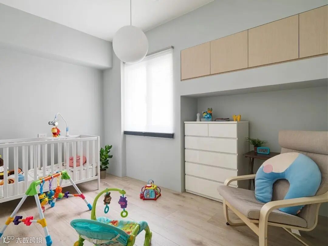 婴儿房位于主卧隔壁,布置很简单,单人沙发方便爸爸妈妈在照顾宝宝的同时得到休息。旁边利用墙体在凹处摆放矮柜,上面又打造了一排内嵌式的收纳柜,实用又不显突兀。