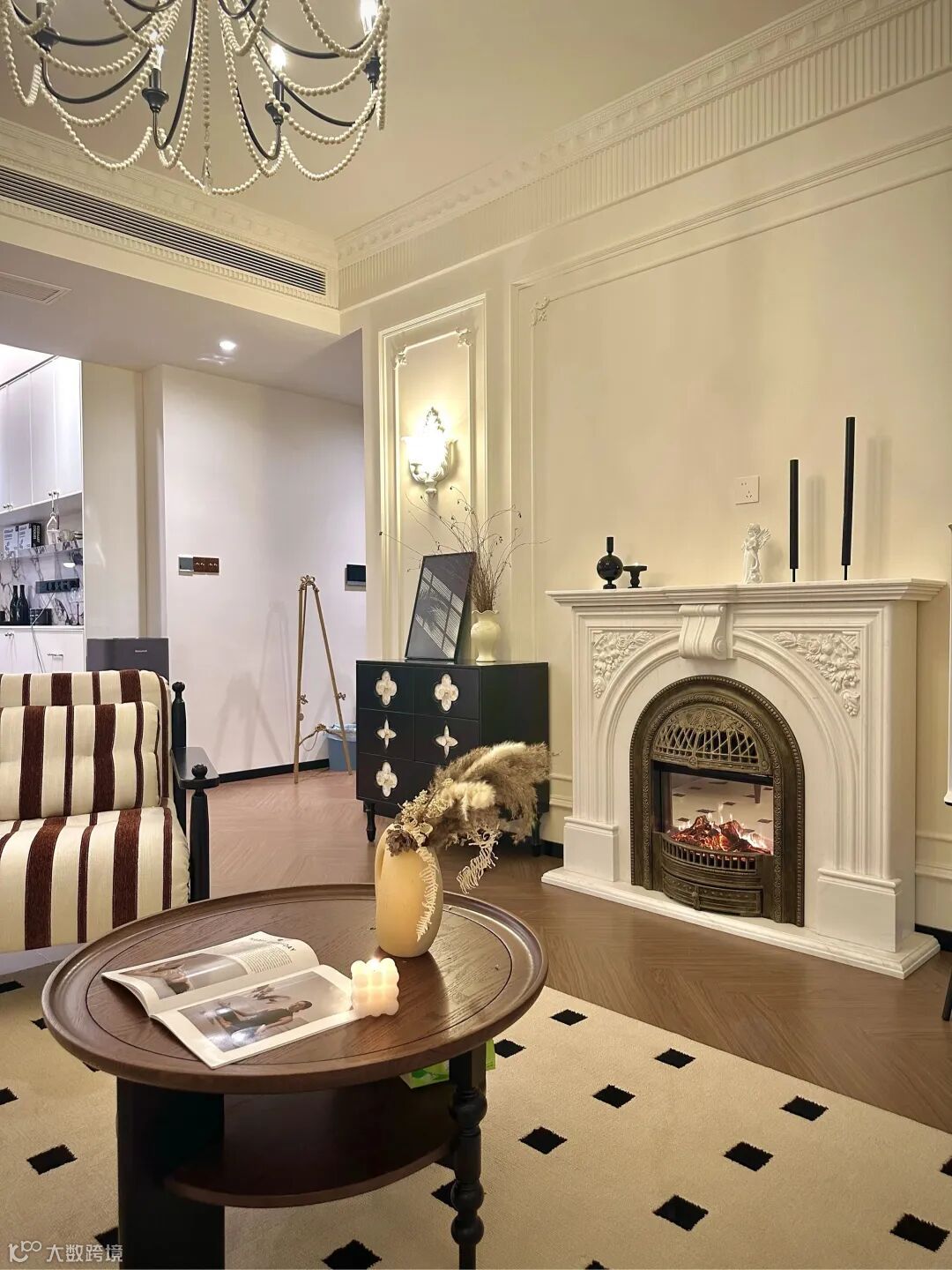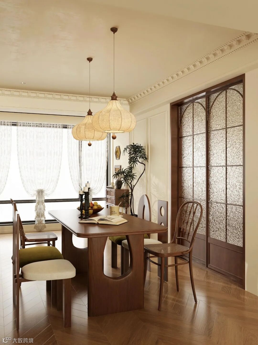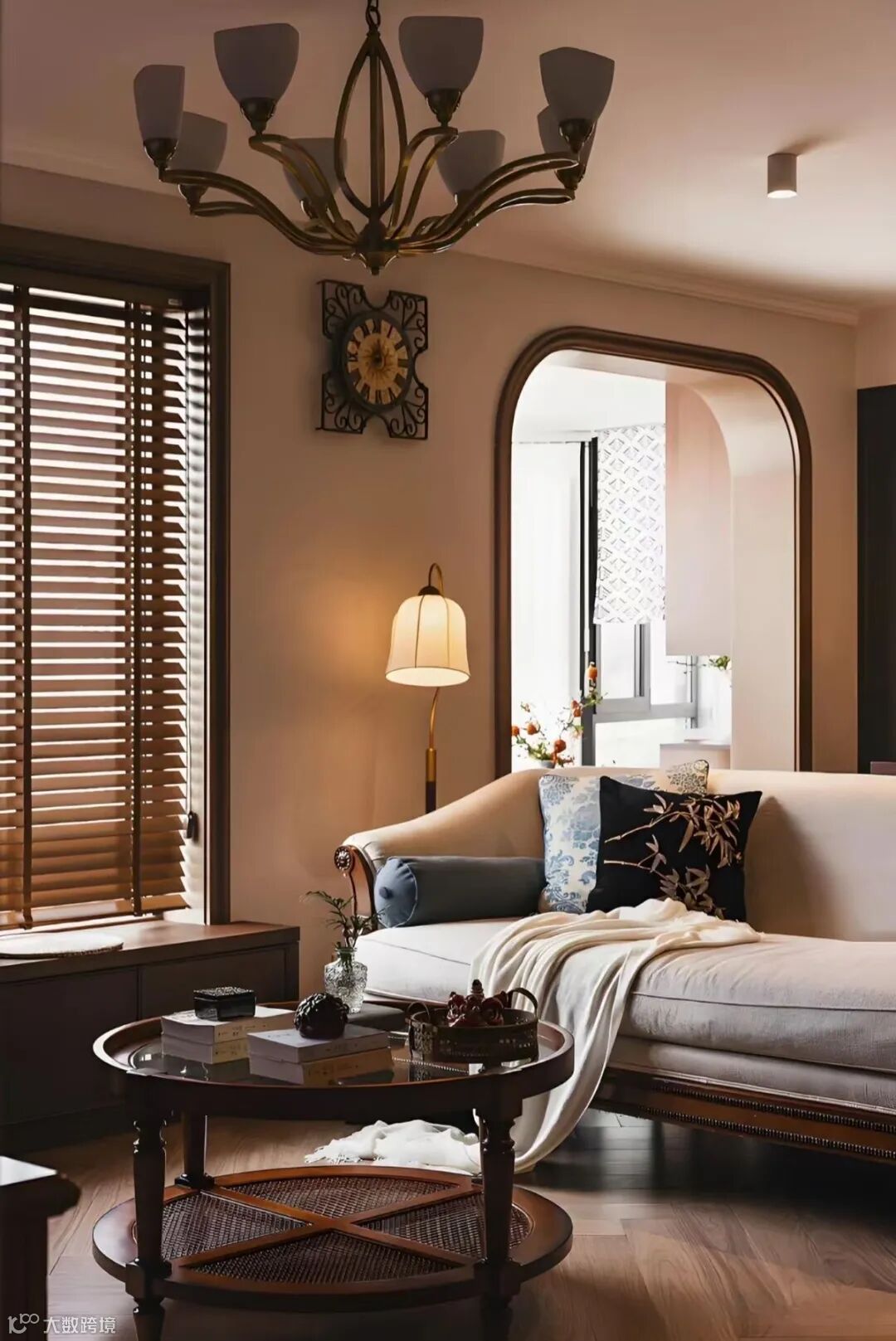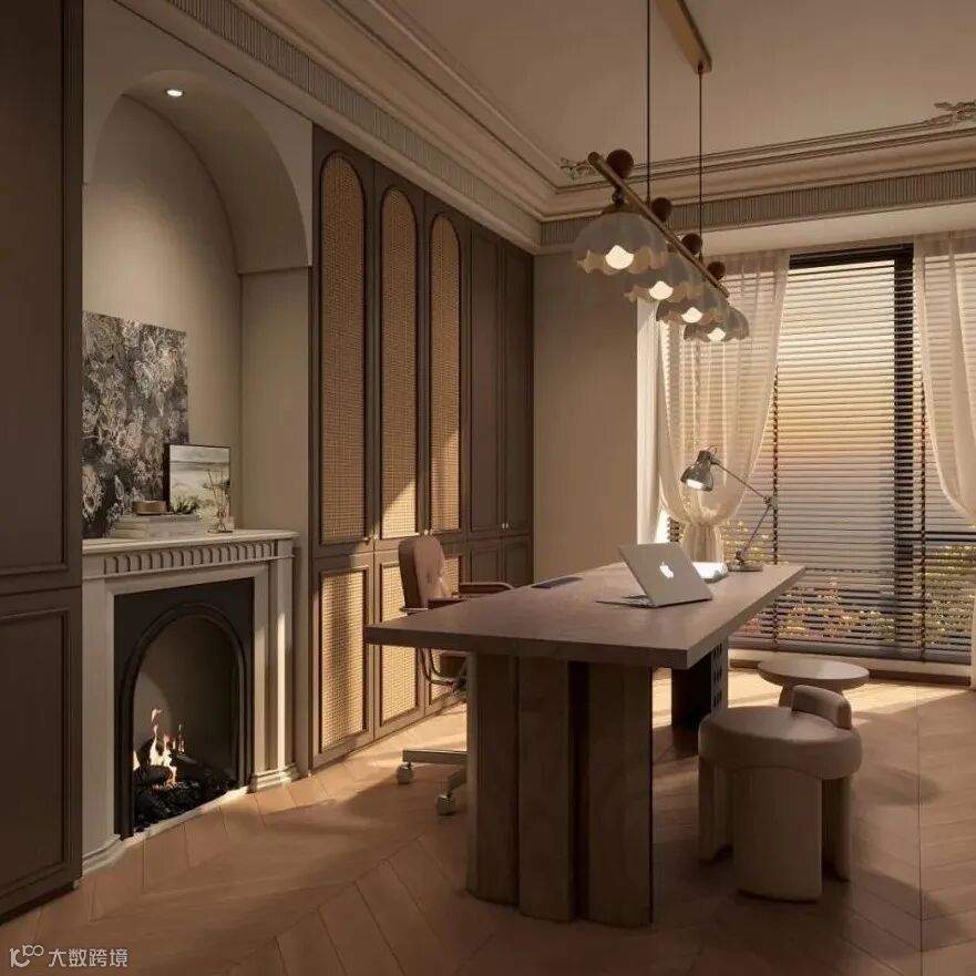 这里提醒一句:别堆太多元素,法式线条和中式肌理比例建议控制在3:7(小户型可调整为4:6,靠更多柔线显通透;大平层可5:5,平衡气场与质感),避免雕花与格栅堆砌,也别让两种风格元素在同一空间“抢戏”,不然会显得杂乱无章。另外,门窗改造也别忽略,普通平开门可贴法式细石膏线收边,搭配中式木质门芯板,低成本就能打造融合感;窗户做弧形窗套,呼应法式调性,同时搭配木质百叶帘,兼顾中古风温润与隐私需求。