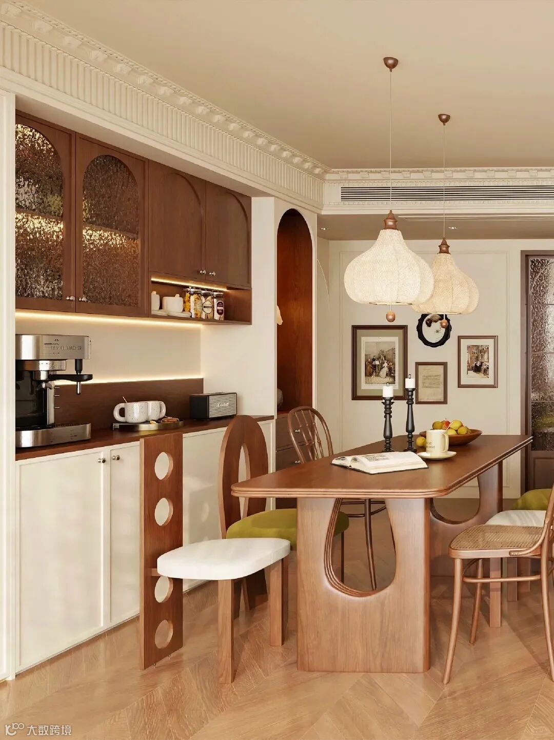 榫卯元素不用大面积铺,在柜体边角、餐桌腿部保留简单榫卯纹路即可,搭配法式细腿设计,减少中式厚重感,更适配现代户型。材质优先选黑胡桃木、白橡木,纹理自然能衬起古韵,搭配石膏线的细腻,质感层次直接拉满。