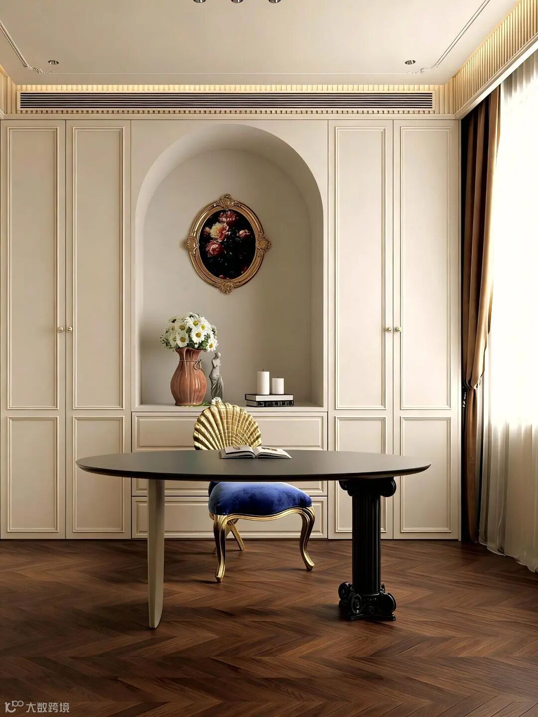 卧室床头背景墙用法式石膏线勾勒半圆轮廓,中间贴浅橡木饰面,柔线与木质感互补,睡前氛围感拉满。我之前有个小户型客户,就用这种思路改造:木格栅电视墙+法式弧形镜框,搭配一把细腿榫卯单人椅,再用黄铜小边几过渡,既没有纯中式的沉闷,也没有纯法式的浮夸,韵味刚好。