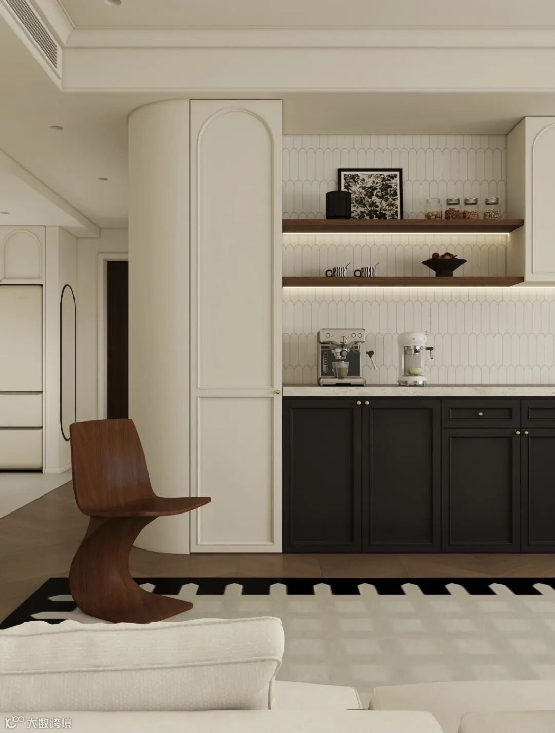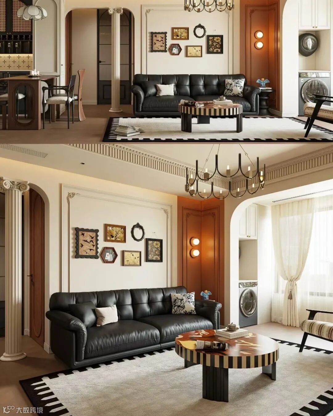 弧形元素是两者融合的关键纽带,既能体现法式温柔,又能呼应中式“圆融”意境,还能中和空间生硬感。比如玄关做法式弧形门洞,搭配中式月洞门造型的木格栅隔断,一进门就有双重风格的层次感;