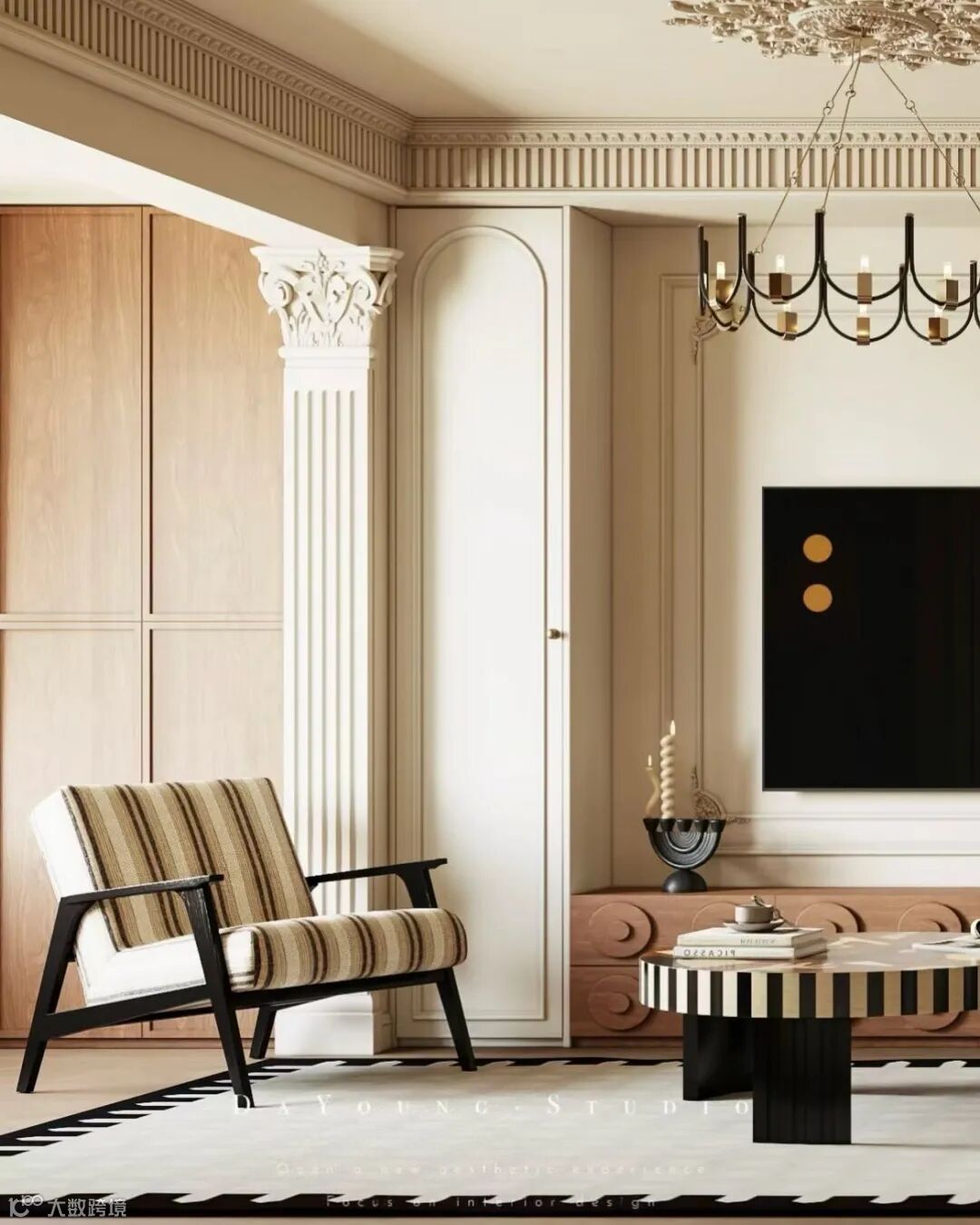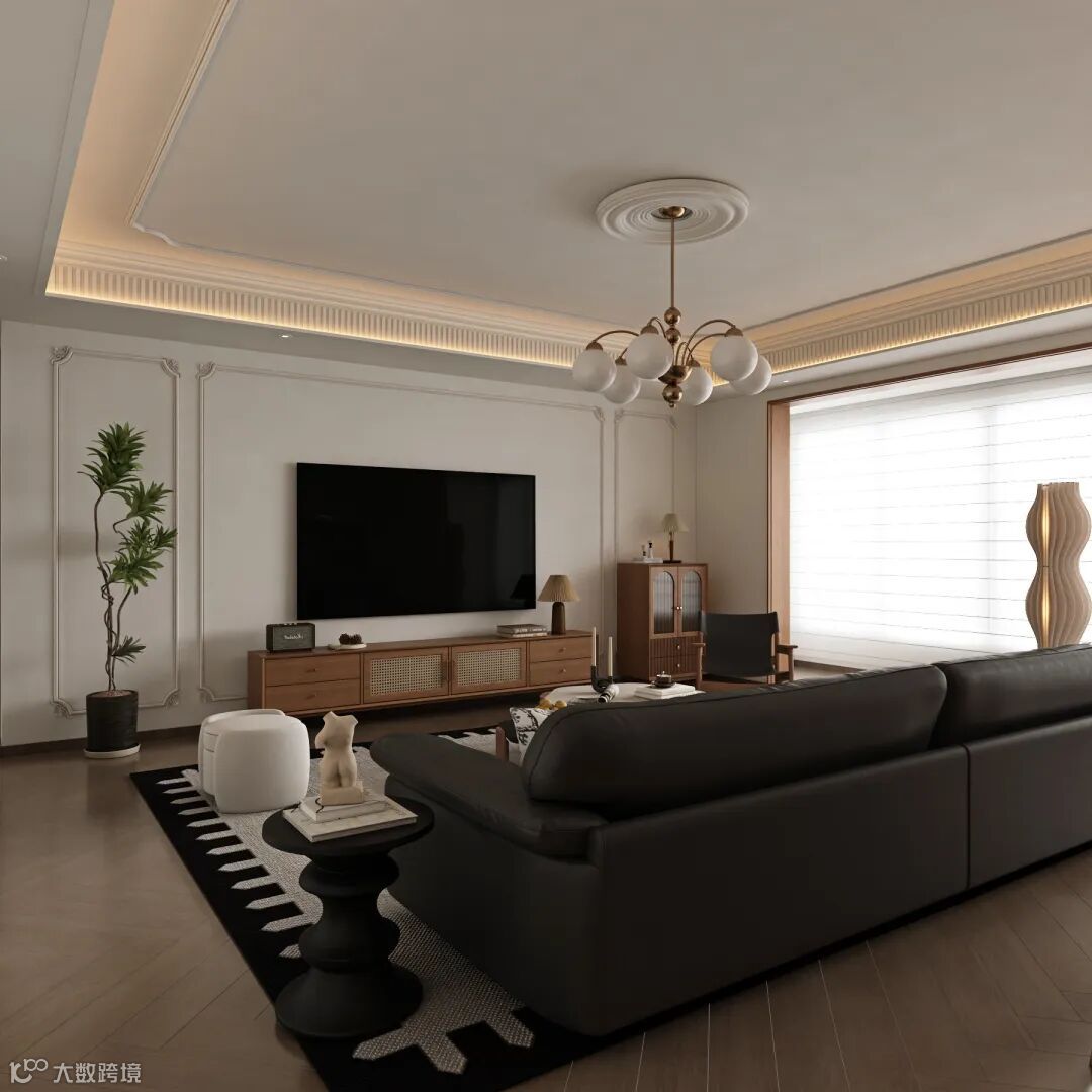 法式中古风的气质,全靠线条“刚柔并济”撑起来——用中古风的木质肌理定调,用法式的柔和线条中和厚重。墙面装饰可以做组合搭配:电视背景墙局部做窄条胡桃木木格栅(中古风核心),边缘贴简约法式PU线条(宽度3-5cm,不做复杂雕花),既有东方肌理的温润,又有法式线条的精致,不会偏向某一方。