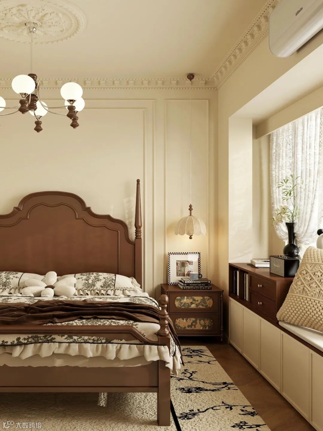 金属元素选黄铜和哑光金的组合:黄铜小五金、木质家具黄铜包边(衬古韵),哑光金石膏线条、吊灯边框(显法式精致),小面积点缀即可,避免大面积亮金、亮银破坏温润基调,也别用黑色金属过多,容易让空间显冷硬。床品、桌布等软装材质优先选棉麻、针织款,颜色选浅咖、米白等中性色,既贴合法式慵懒,又能衬托木质元素,避免选过于花哨的印花款,以免打乱整体调性。