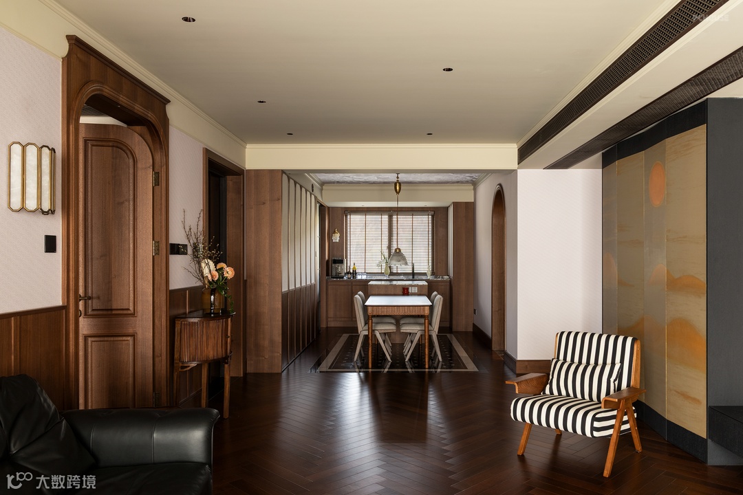 壁纸搭配木质半墙是海派、复古等常见的手法。不过这里使用了定制的太阳锁子纹壁纸,寓意“安全、团结、防护和祝福”,馥郁的木质调在不同的空间中呼应。