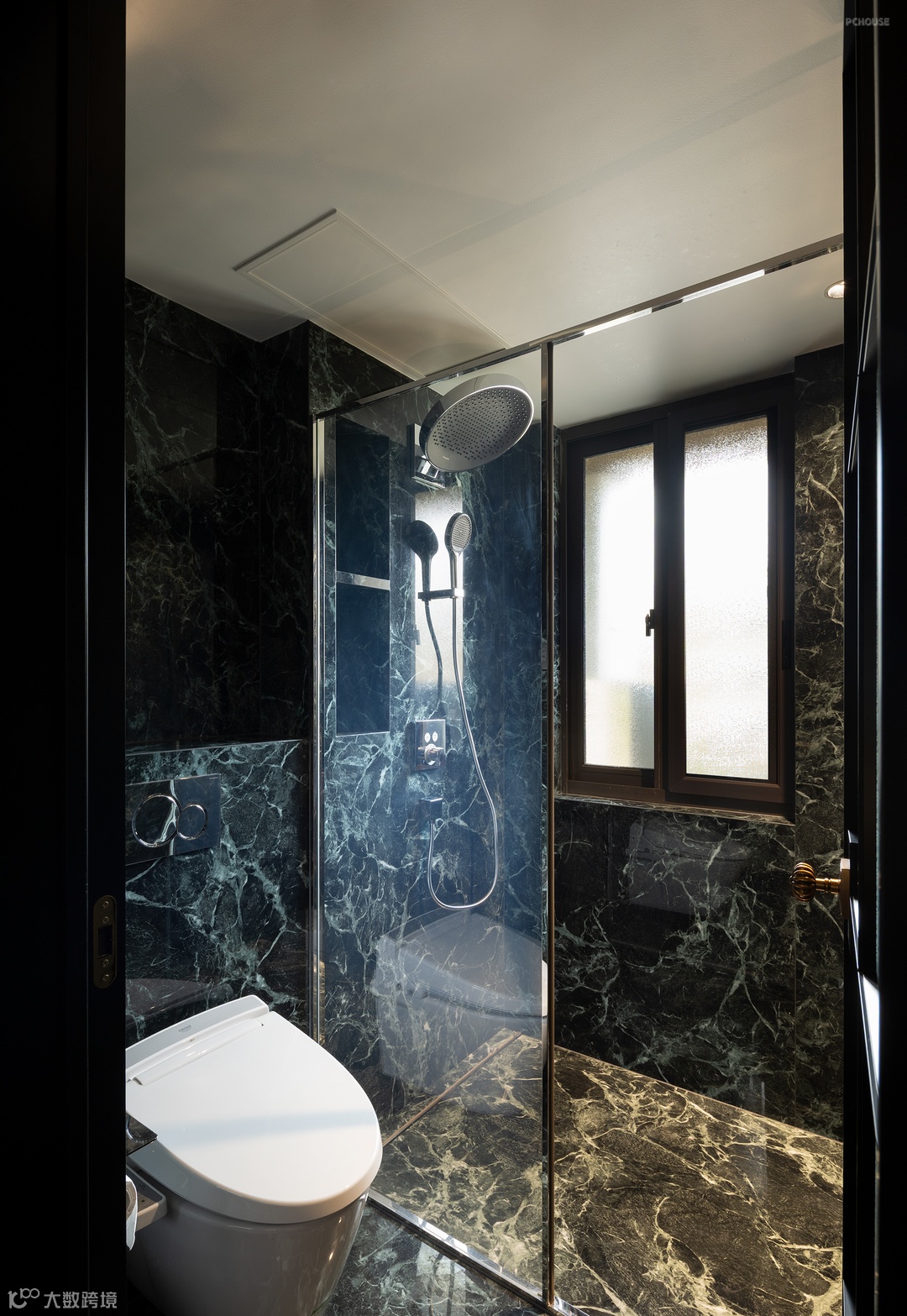 从餐厅到北次卧需经过客卫,将干区外移,拱形门洞,顶部铺设的手工锤纹金箔与墙壁、地面的深绿色普拉达岩板形成大胆的对冲色。