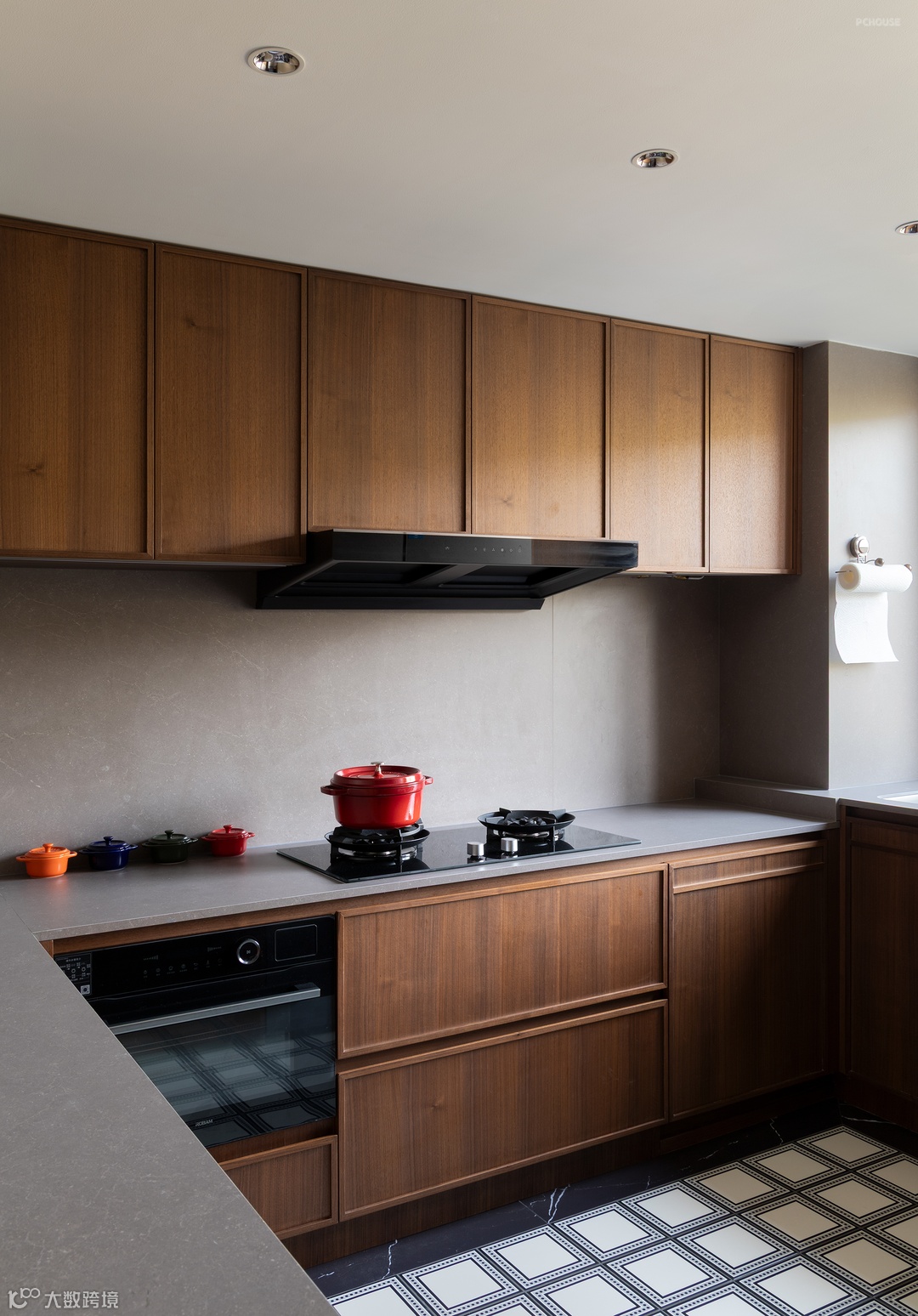 推开小方格玻璃移门便是厨房,U型操作台提供了充足的操作与摆放空间。灶具上方做了吊柜,可以储存罐头等食品,方便拿取。