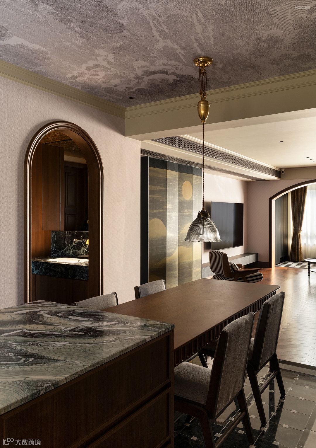 中岛与水吧台使用紫山水大理石做台面,深紫基调上流淌着白色与清透青绿纹路,脉络如河川,如东方山水水墨画卷铺陈。中岛台面选浅色,水吧台用深色,通过色彩递进自然划分层次。