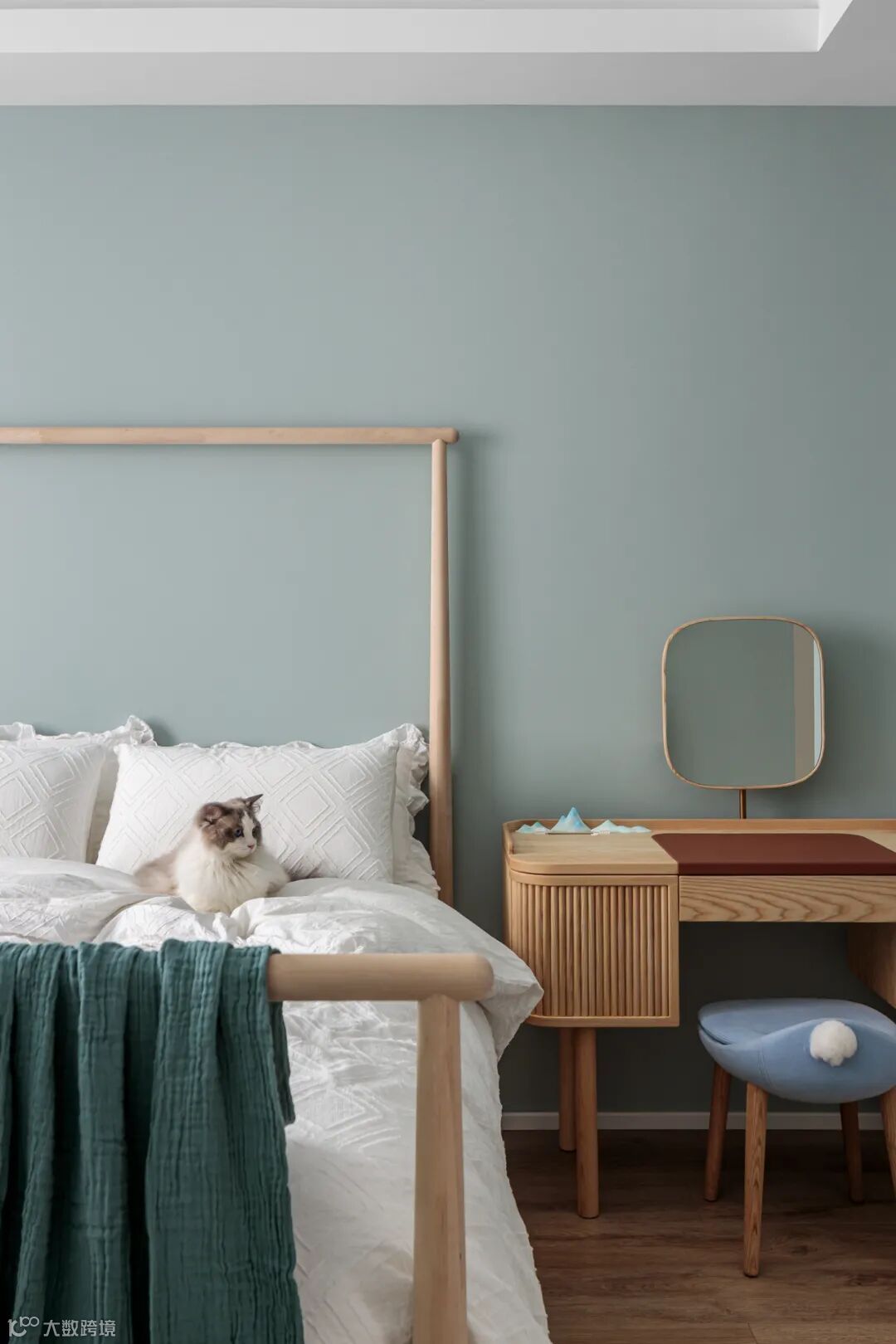 女主人偏爱冷色调中的蓝绿系,空间墙面运用了豆蔻青,引入户外的闲适气息。简洁的设计,静心惬意,同时也能感受到木质材料传递的温度。