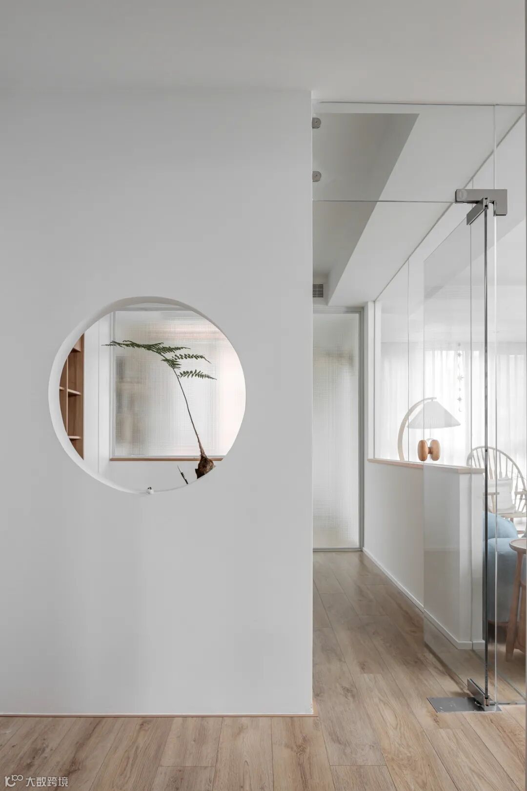 电梯到达7楼,打开大门正面迎来的便是将空间退移1060mm后呈现的圆形端景。