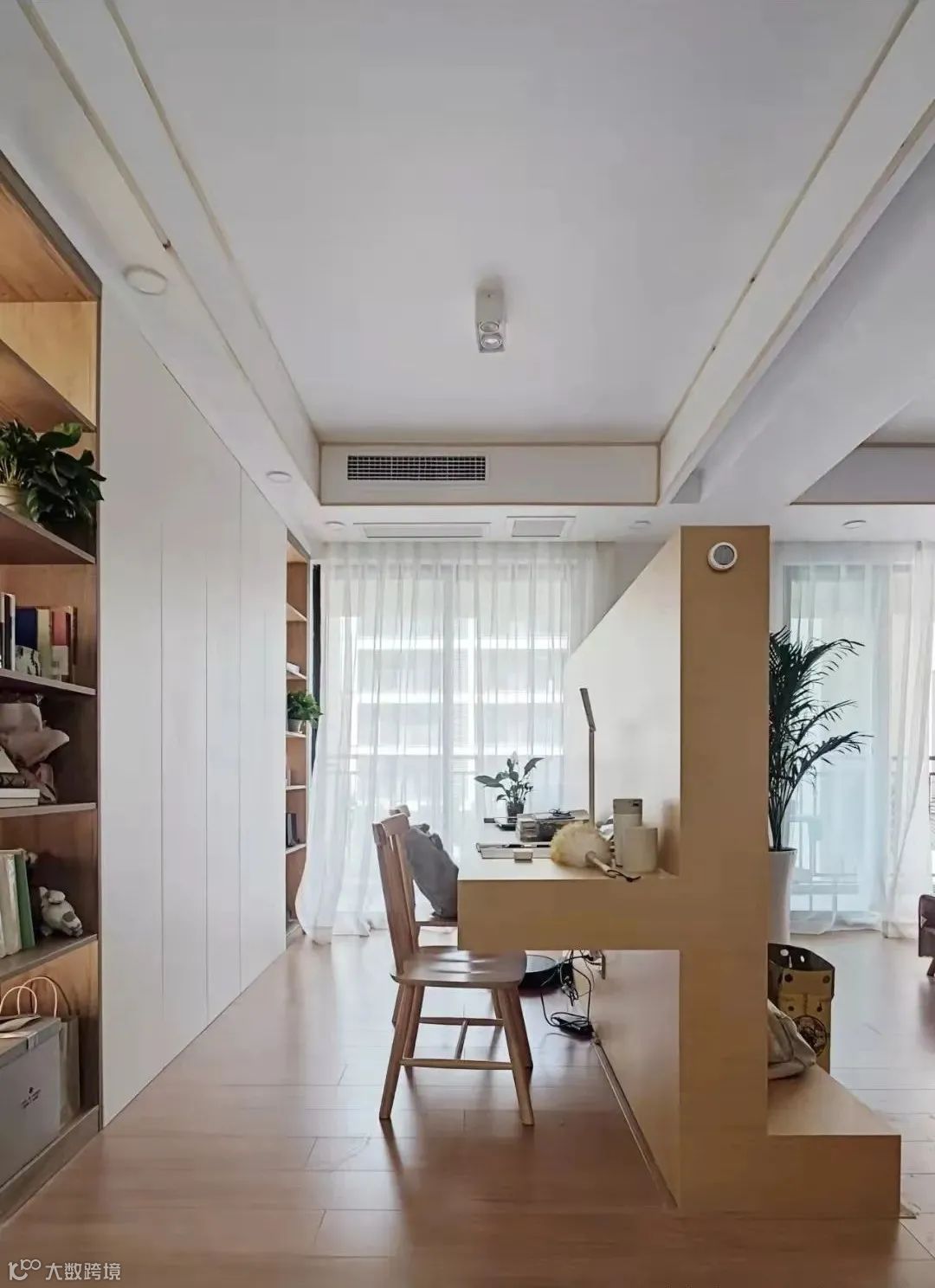 电视墙打破传统设计,用原木板定制了与书桌一体的电视墙,半高的电视墙让空间隔而不断。