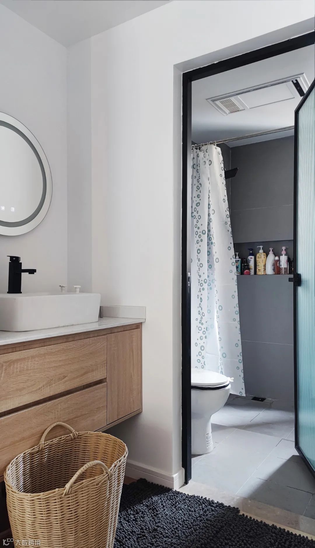 卫生间干湿分离,湿区内部由于空间有限,用浴帘作为隔断。