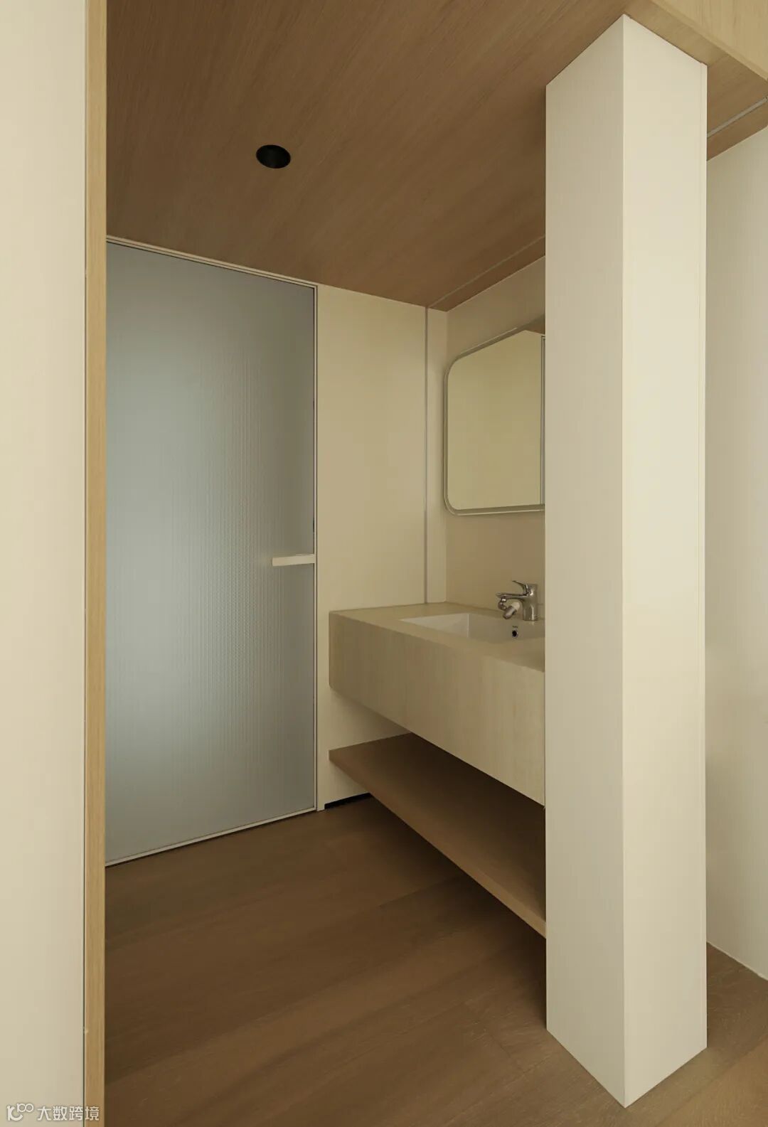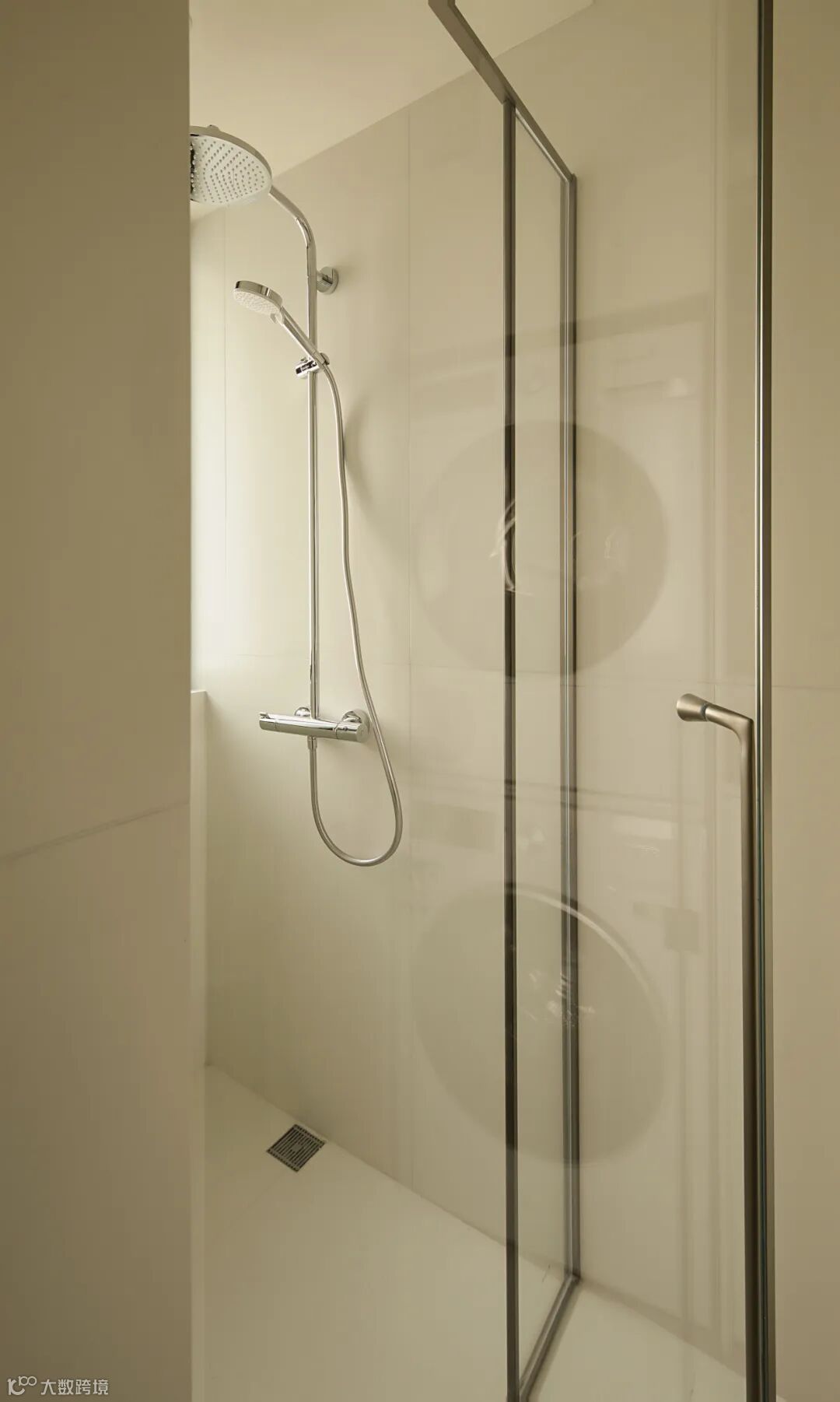 墙地面统一的米色系墙砖,视觉柔和高级,空间感上也更整体显大。考虑屋主平时没有晾晒的需求,于是把洗衣机烘干机放在卫生间区域,方便洗完澡随手清洗衣物,也避免了噪音问题。