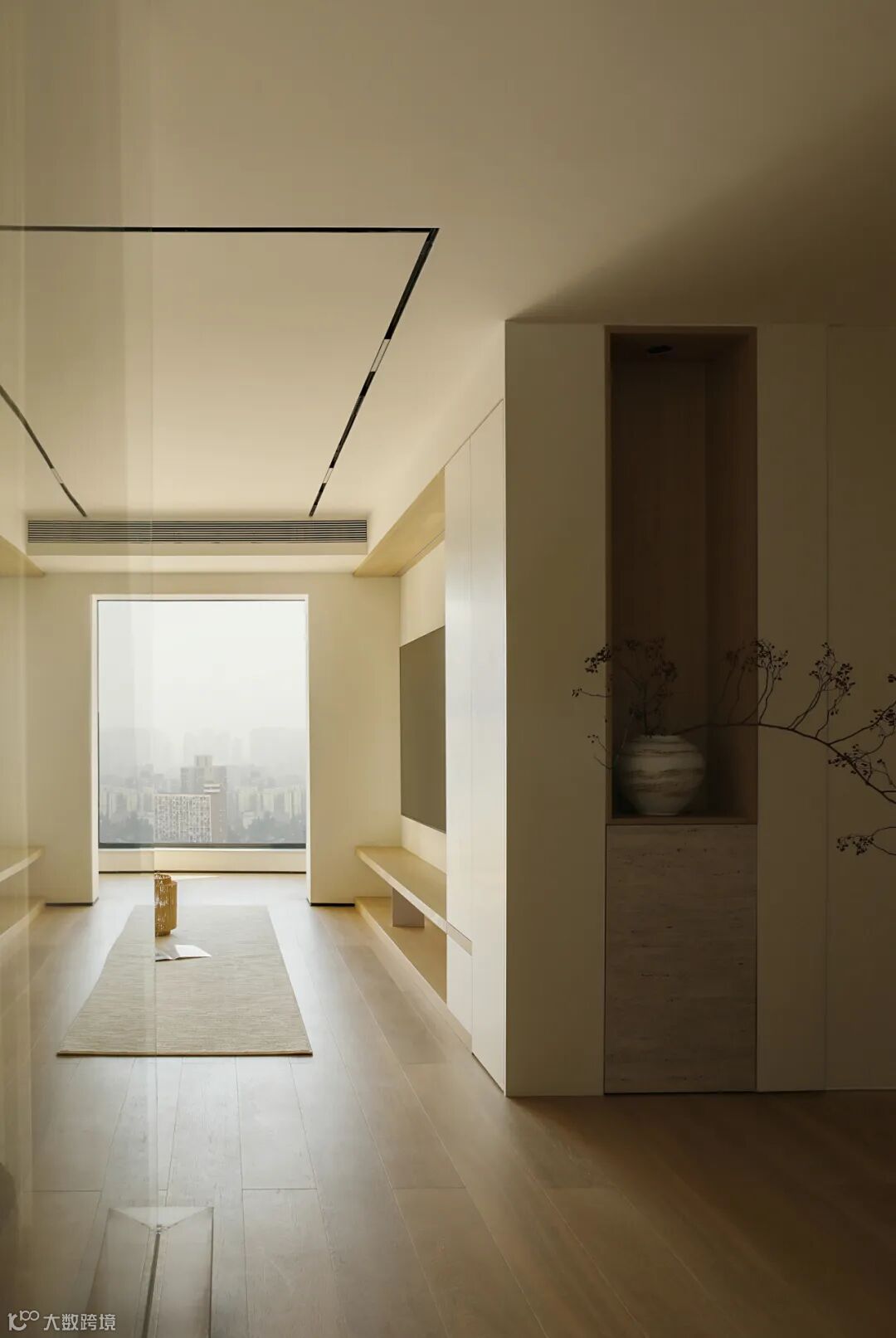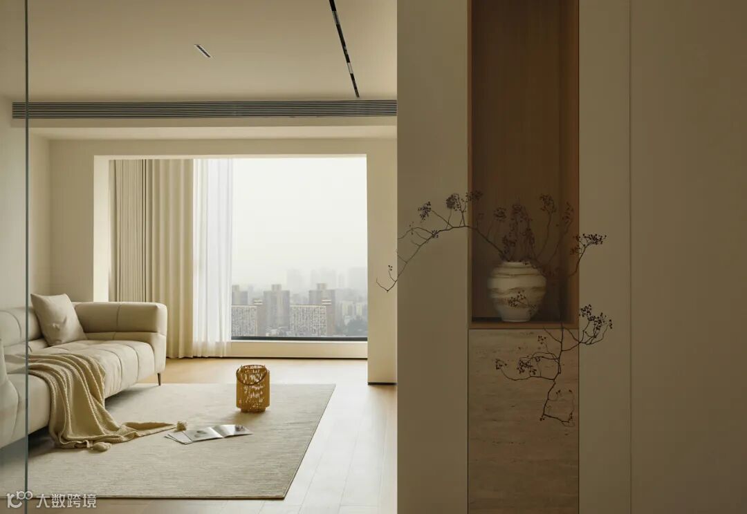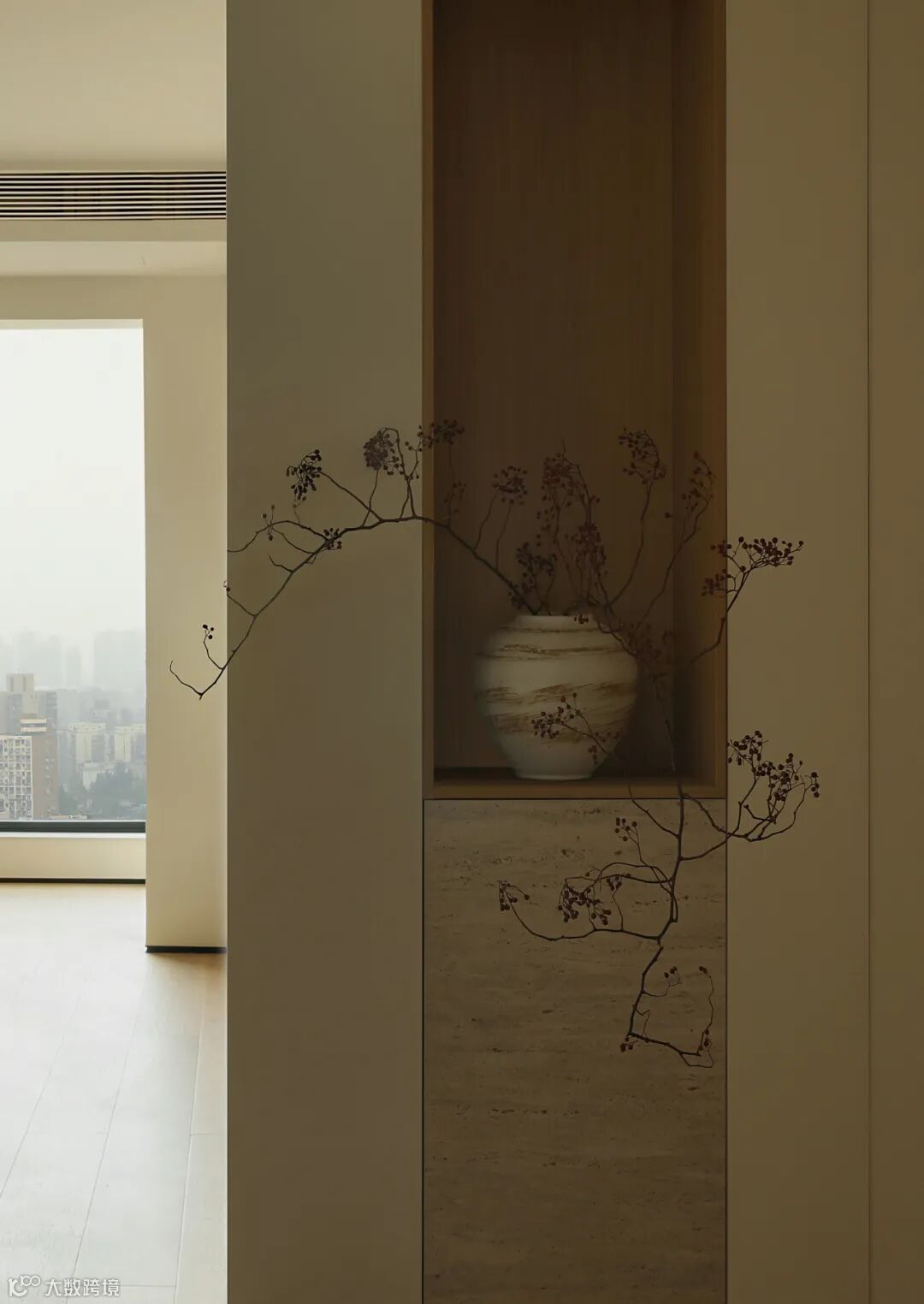 一旁的洞石与原木交织,侘寂花瓶中干枝摇曳点缀,营造出自然禅意的空灵意境。