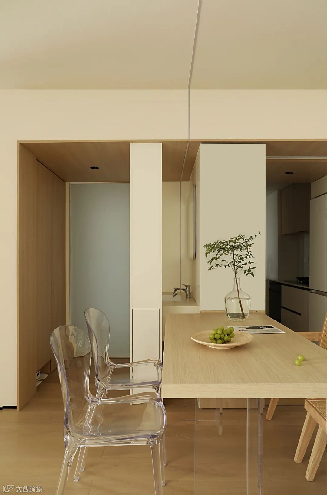 同时预留足够的动线过道空间,也是进家的主通道。原木色的餐桌也与整个空间的木色相呼应,亚克力材质的餐椅更是扩大了餐厅的视觉角度。