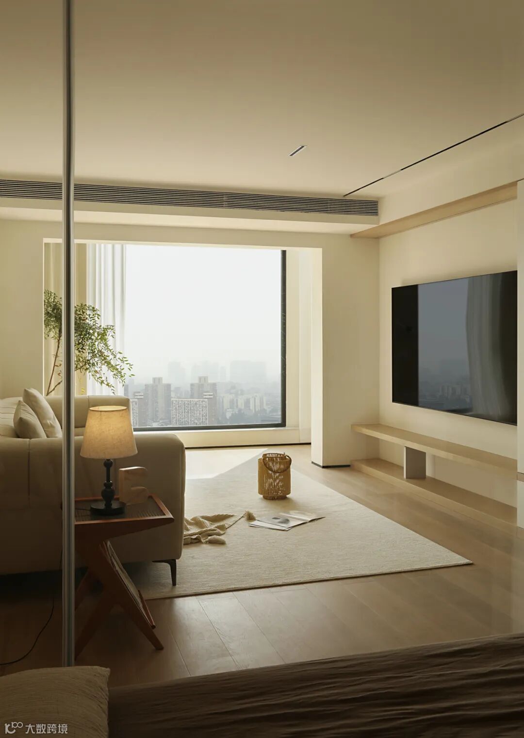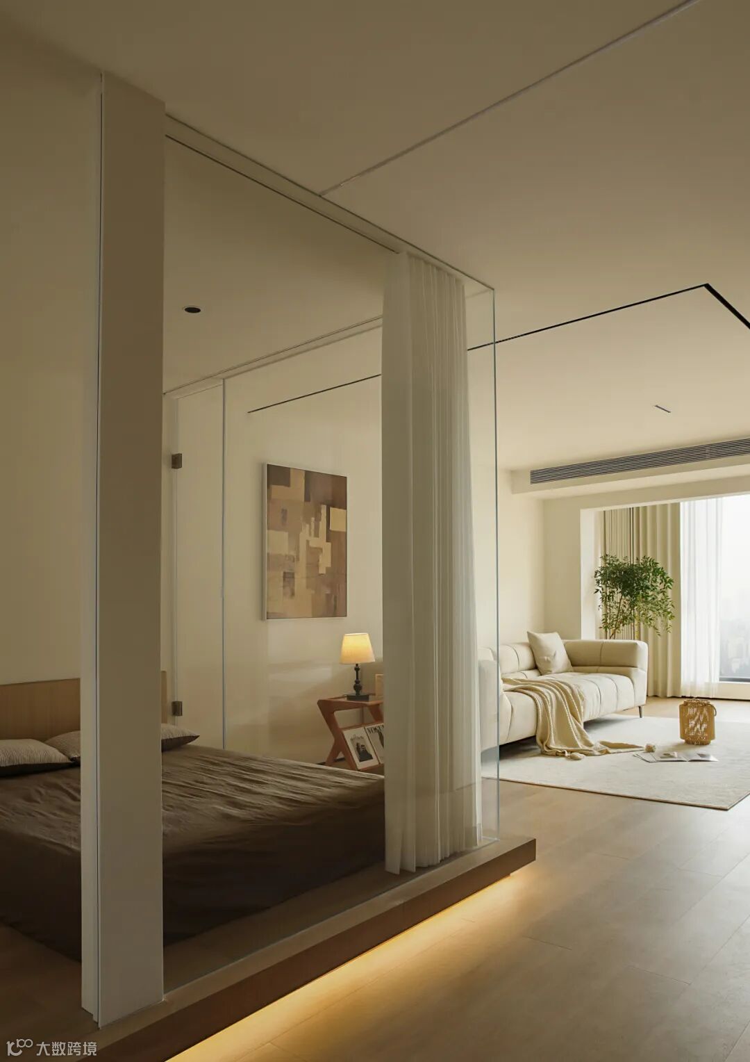 从这看向客厅,玻璃材质让视觉无遮挡,把睡眠区与公区关联,打破空间壁垒让生活更自由随性。