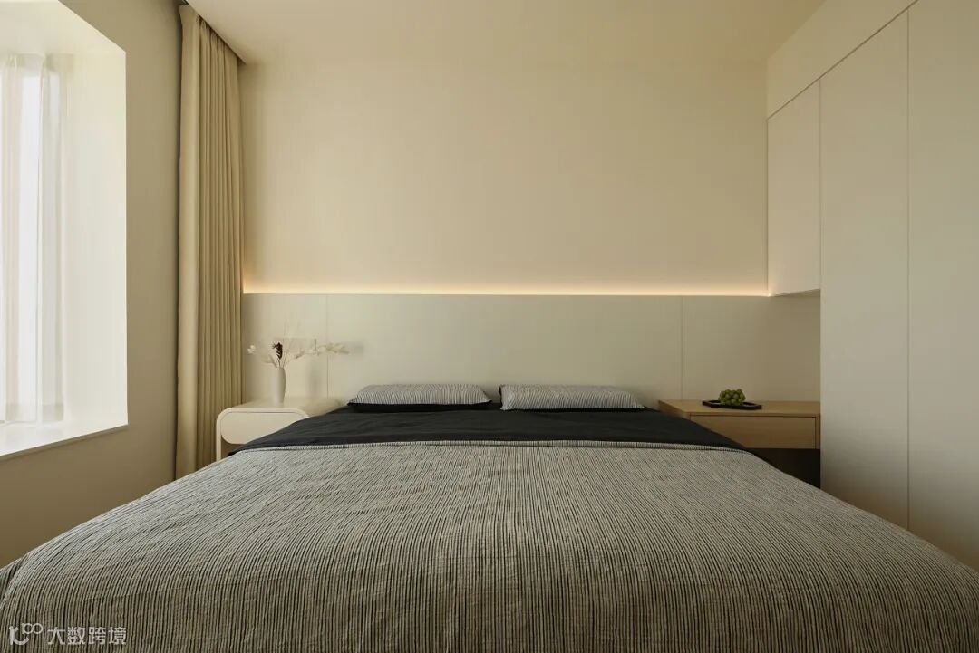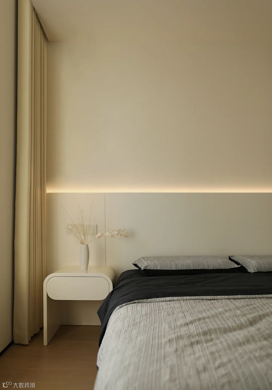 背景墙采用半高的木饰面设计,来满足床靠背的同时更加节省空间,并在背后提前内嵌灯带设计与顶面反光灯带相呼应,提升卧室氛围感。