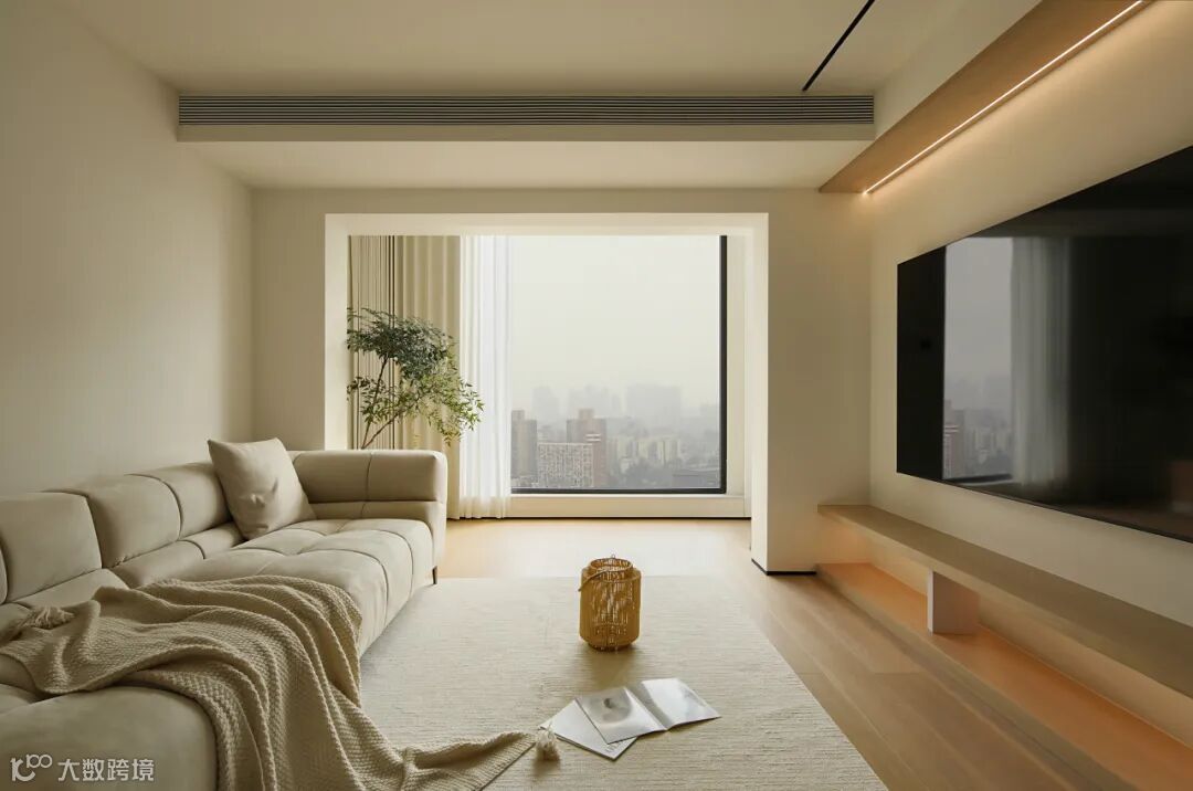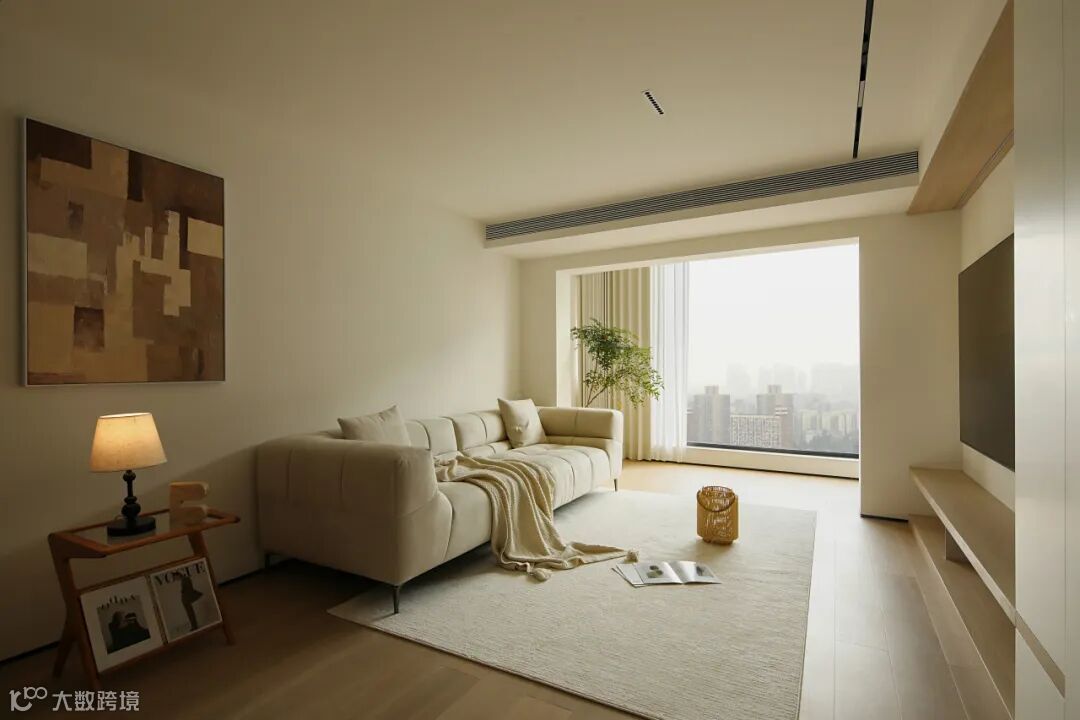 墙面、沙发、地毯色调统一,以极简的修饰手法,软硬结合丰富空间视觉层次。阳台打通纳入室内,落地窗设计来增加室内采光与通透感。