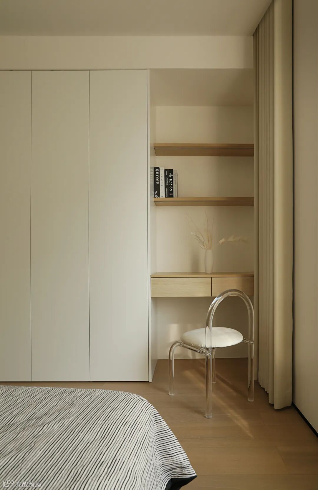 原木床头柜与衣柜做衔接一体设计,来完美利用转角空间,让卧室空间更加宽敞。床尾则是做了一整排的衣柜与梳妆台完美穿插融合,也可作为临时办公。