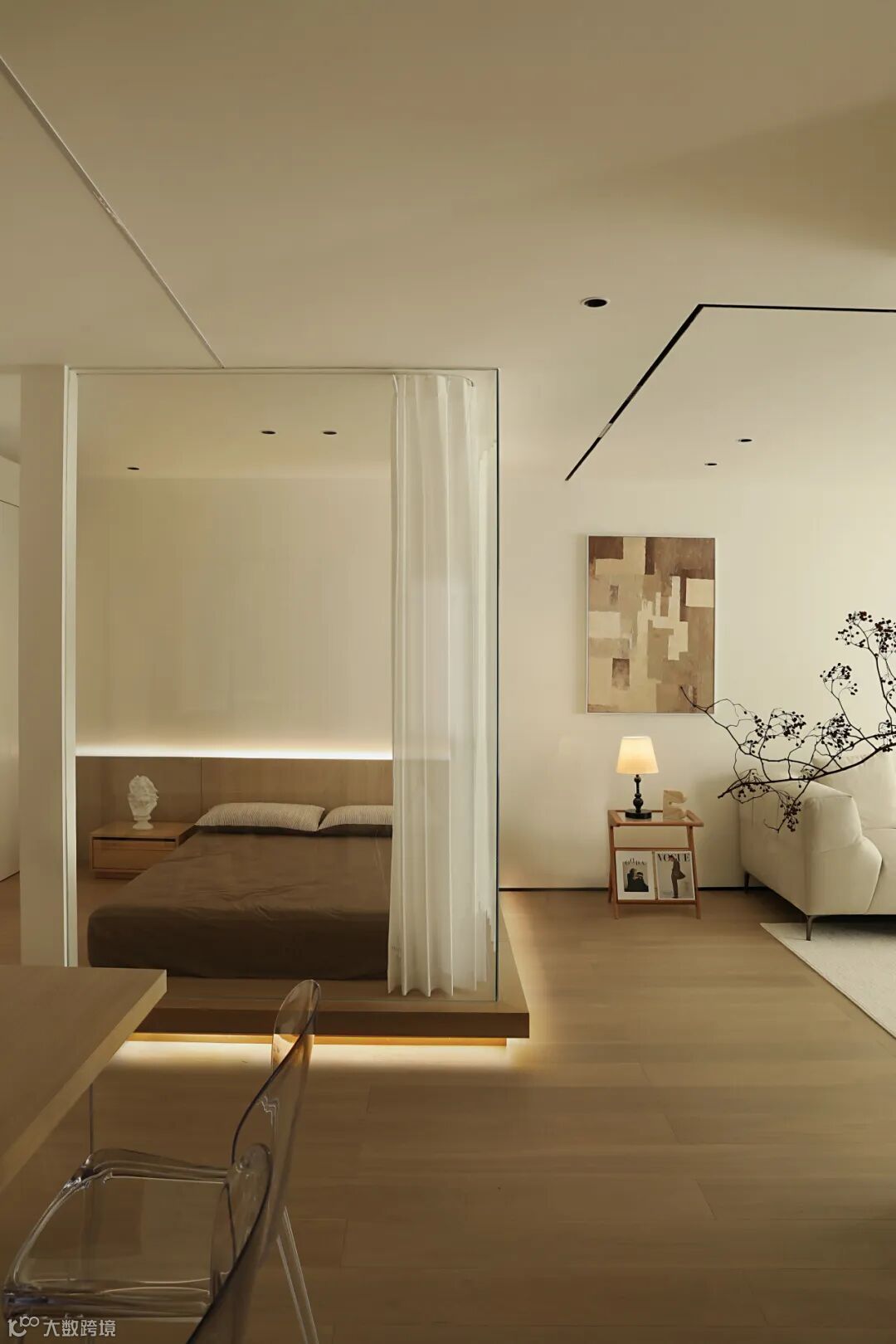 次卧以玻璃隔断+地台设计,床头背景墙以原木饰面装饰,和白色墙面相得益彰自然又治愈,一字延伸+灯带点缀增强空间设计感。